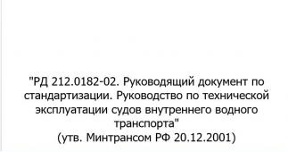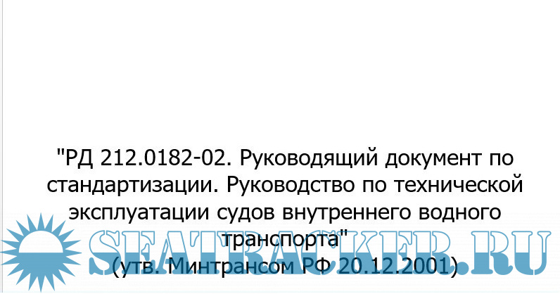 Описание: "РД 212.0182-02. Руководящий документ по стандартизации. Руководство по технической эксплуатации судов внутреннего водного транспорта (утв. Минтрансом РФ 20.12.2001).