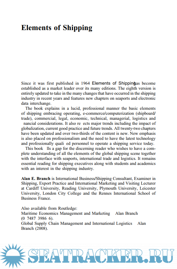 Year: 2007 Language: english Author: Alan E. Branch Genre: Textbook Format: PDF Quality: eBook Pages count: 523 Description: The book explains in a lucid, professional manner the basic elements of shipping embracing operating, e-commerce/computerization (shipboard/trade), commercial, legal, economic, technical, managerial, logistics and financial considerations. It also reflects major trends including the impact of globalization, current good practice and future trends. All twenty-two chapters have been updated and over two-thirds of the content is new. New emphasis is also placed on professionalism and the need to have the latest technology and professionally qualified personnel to operate a shipping service today