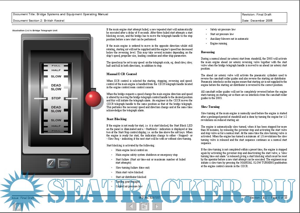 Year: 2005 Language: english Author: Worldwide Marine Technology ltd. Genre: Documentation Format: PDF Quality: eBook Pages count: 286 Description: The purpose of this ‘one-stop’ manual is to assist, inform and guide competent ship’s staff, and trainees in the operation of the systems and equipment on board and to provide additional information that may not be otherwise available. In some cases, the competent ship’s staff and trainees may be initially unfamiliar with this vessel and the information in this manual is intended to accelerate the familiarisation process. It is intended to be used in conjunction with shipyard drawings and manufacturer’s instruction manuals, bulletins, Fleet Regulations, the ship’s Captain’s and Chief Engineer’s Standing Orders and in no way replaces or supersedes these publications, all of which take precedence over this manual. Information relevant to the operation of the British Kestrel has been carefully collated in relation to the systems of the vessel and is presented in three on board volumes consisting of BRIDGE SYSTEMS AND EQUIPMENT OPERATING MANUAL, CARGO OPERATING MANUAL and MACHINERY OPERATING MANUAL. This release contains Bridge Systems and Equipment Operating Manual.