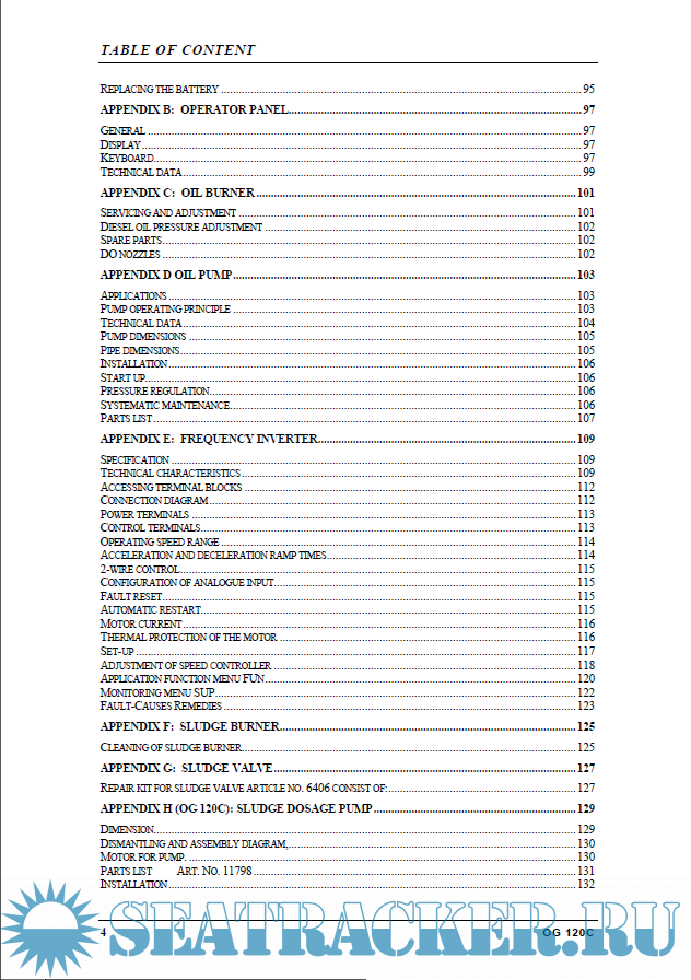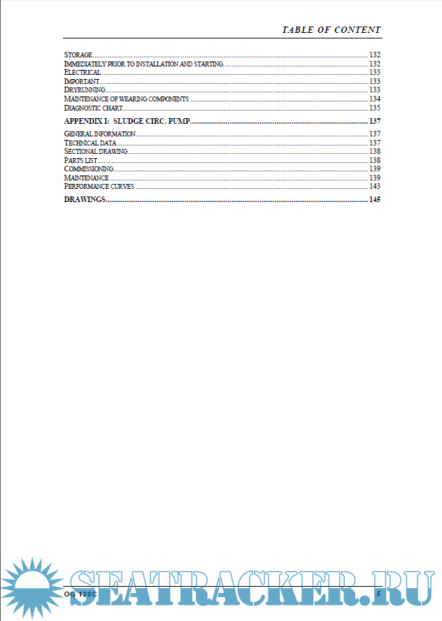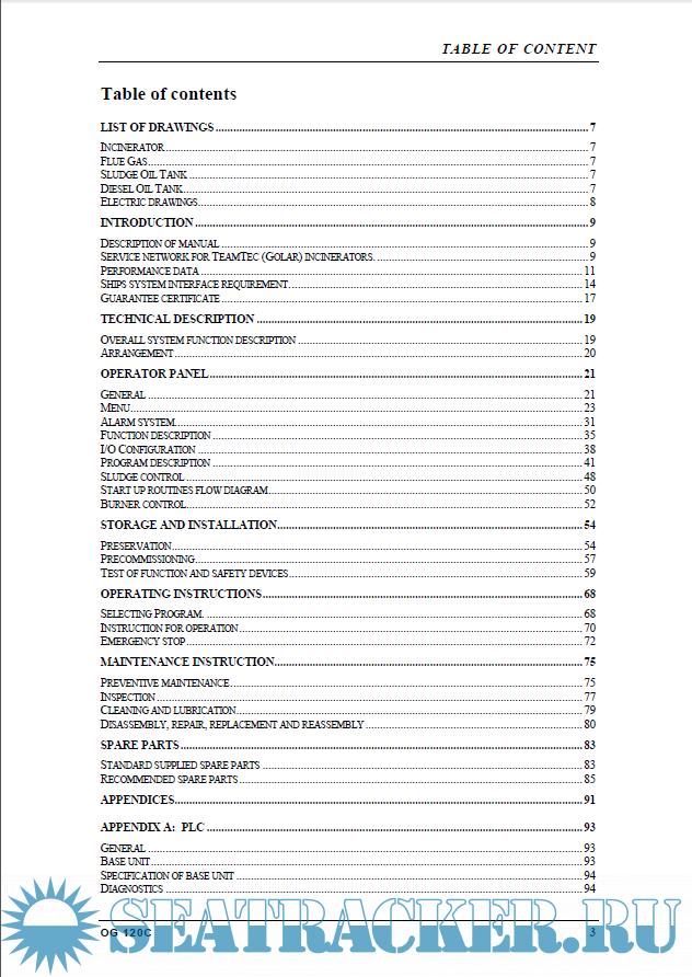 List of drawings Introduction Technical description Operator panel Storage and installation Operating instructions Maintenance instruction Spare parts Appendices Drawings