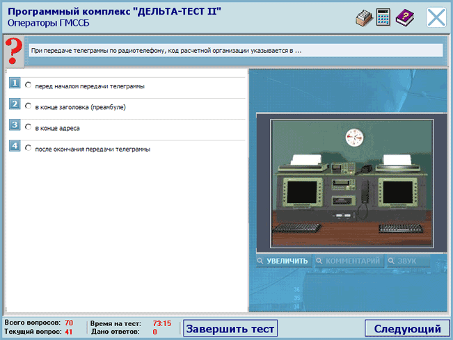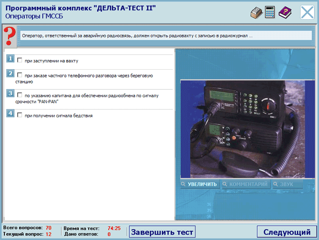 Описание: ПК "Дельта-ГМССБ" и ПК "Дельта-Электроник" - совместные разработки ГМА им.адм.С.О.Макарова и ООО "СТОРМ", предназначенные для проверки знаний судовых радиоспециалистов ГМССБ на соответствие национальным и конвенционным требованиям к знаниям операторов ограниченного района ГМССБ, операторов ГМССБ, береговых специалистов ГМССБ и радиоэлектроников 2-го класса.