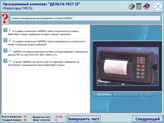 Дельта II ГМССБ тест Совместимость с Windows7: полная Системные требования: MS Windows XP, 7 (x86/x64) Язык интерфейса: только русский Таблэтка: Не требуется Описание: ПК "Дельта-ГМССБ" и ПК "Дельта-Электроник" - совместные разработки ГМА им.адм.С.О.Макарова и ООО "СТОРМ", предназначенные для проверки знаний судовых радиоспециалистов ГМССБ на соответствие национальным и конвенционным требованиям к знаниям операторов ограниченного района ГМССБ, операторов ГМССБ, береговых специалистов ГМССБ и радиоэлектроников 2-го класса. Технологической основой ПК "Дельта-ГМССБ" является оболочка тестирования ПК "Дельта-Тест". Программные комплексы содержат базы данных, состоящие из более чем 600 вопросов по всем разделам примерных программ подготовки радиоспециалистов. ПК "Дельта-ГМССБ" и ПК "Дельта-Электроник" могут быть использованы: в Морских квалификационных комиссиях в качестве элемента квалификационного экзамена в Судоходных компаниях для проведения проверок знаний плавсостава в Морских УТЦ ГМССБ в качестве элемента квалификационного экзамена, для проведения входного тестирования по программам переподготовки радиоспециалистов ГМССБ, для обеспечения контроля за подготовкой слушателей в процессе проведения занятий в учебных заведениях Минтранса России и Госкомрыболовства для обучения курсантов судоводительских и радиотехнических факультетов (отделений) по программам подготовки радиоспециалистов в крюинговых компаниях для проверки знаний моряков при приеме на работу. Содержание ПК "Дельта-ГМССБ" Содержание ПК "Дельта-Электроник" Темы: Национальные требования РФ в ГМССБ Содержание Дельта-ГМССБ Основы ГМССБ Эксплуатационные требования к оборудованию ГМССБ Основные принципы и возможности МПС и МПСС Диагностика оборудования ГМССБ Радиотелефония Правила проведения измерений Системы связи и оповещения ГМССБ Схемотехника Система связи УБПЧ Техническое обслуживание оборудования ГМССБ Система ЦИВ Ремонт оборудования ГМССБ Система Инмарсат Система РЛО АРБ в ГМССБ Информация по безопасности на море Процедуры аварийной радиосвязи Доп. информация: На иллюстрациях показаны типичные задания, в которых экзаменуемый должен: ввести текст ответа на вопрос с клавиатуры; отметить все ответы на вопрос, которые он считает правильными; выбрать единственный правильный ответ на вопрос из числа предложенных; установить соответствие одного утверждения другому. Все вопросы, включенные в базу данных программы, классифицируются: по виду проверки (функции) по теме по степени важности (приоритету) степени сложности Использование этих сведений позволяет экзаменатору конструировать различные варианты проведения тестов (шаблоны тестов): комплексные тесты, тесты для проверки знаний по отдельным темам. Архив хранит сведения о всех проверках, выполненных при помощи программы. Для того чтобы получить сведения о результатах конкретного лица, необходимо найти соответствующую запись в архиве (для удобства пользователей предлагается система фильтров - по дате, фамилии, организации, должности) и выбрать нужный вид отчета: отчет о результатах теста; отчет, содержащий сведения о правильных ответах и всех допущенных при проведении тестирования ошибках; отчет, содержащий все ответы экзаменуемого. На иллюстрации показан фрагмент отчета содержащего ответы, которы