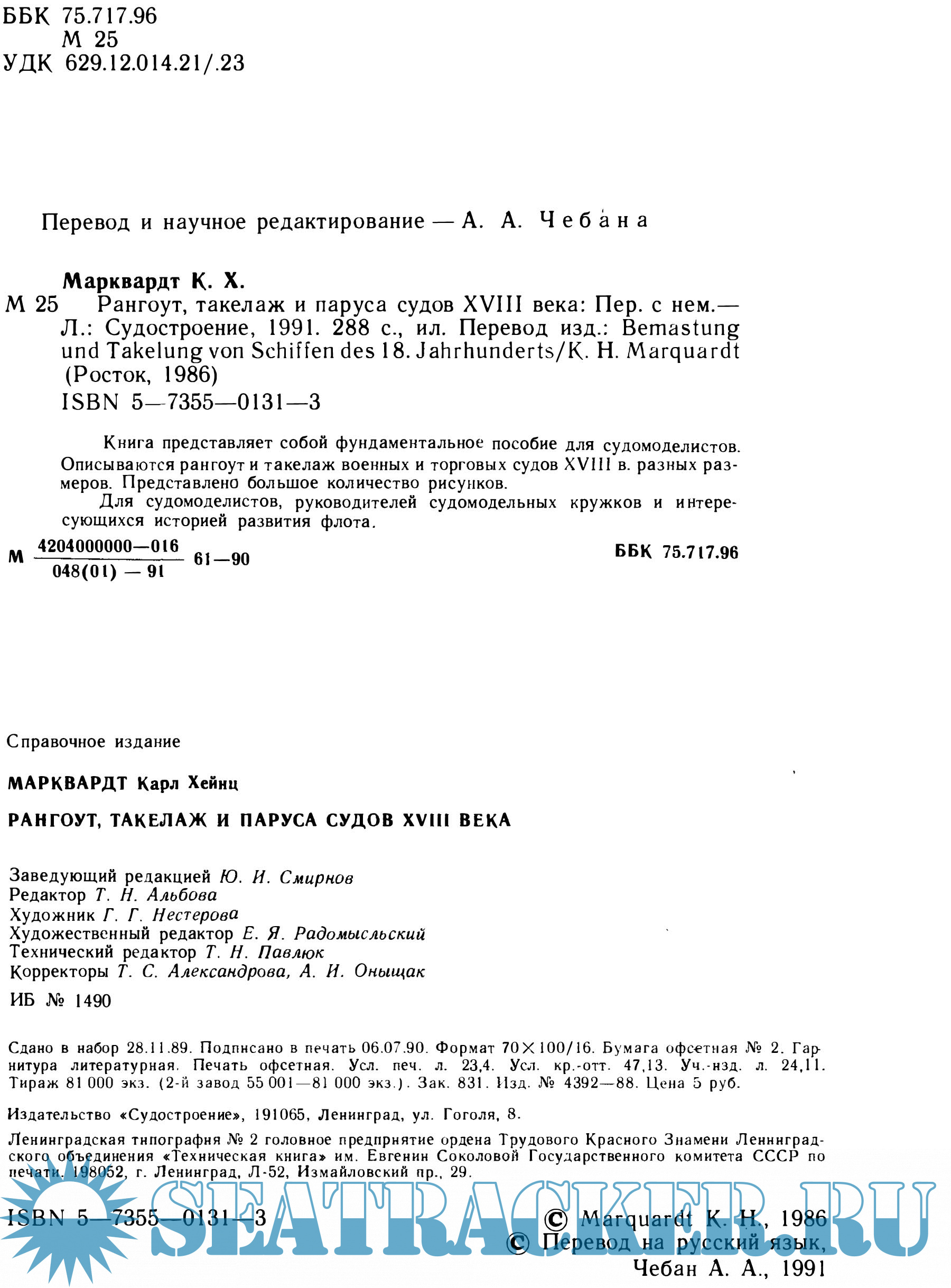 Описание: Многие годы, в течение которых автор занимался судомоделизмом, при разработке чертежей моделей судов постоянно сталкивался с тем, что чрезвычайно трудно получить достаточные и достоверные в отношении определенной эпохи данные о рангоуте и такелаже судов. Многие моделисты, безусловно, тоже встречались с этой проблемой : большинство построенных моделей должны были бы иметь лучшее вооружение. Как часто точные сведения о корпусе кончаются, когда речь заходит о рангоуте, такелаже и парусах, где фантазия не имела границ. Причина этому - скудость построечных данных.