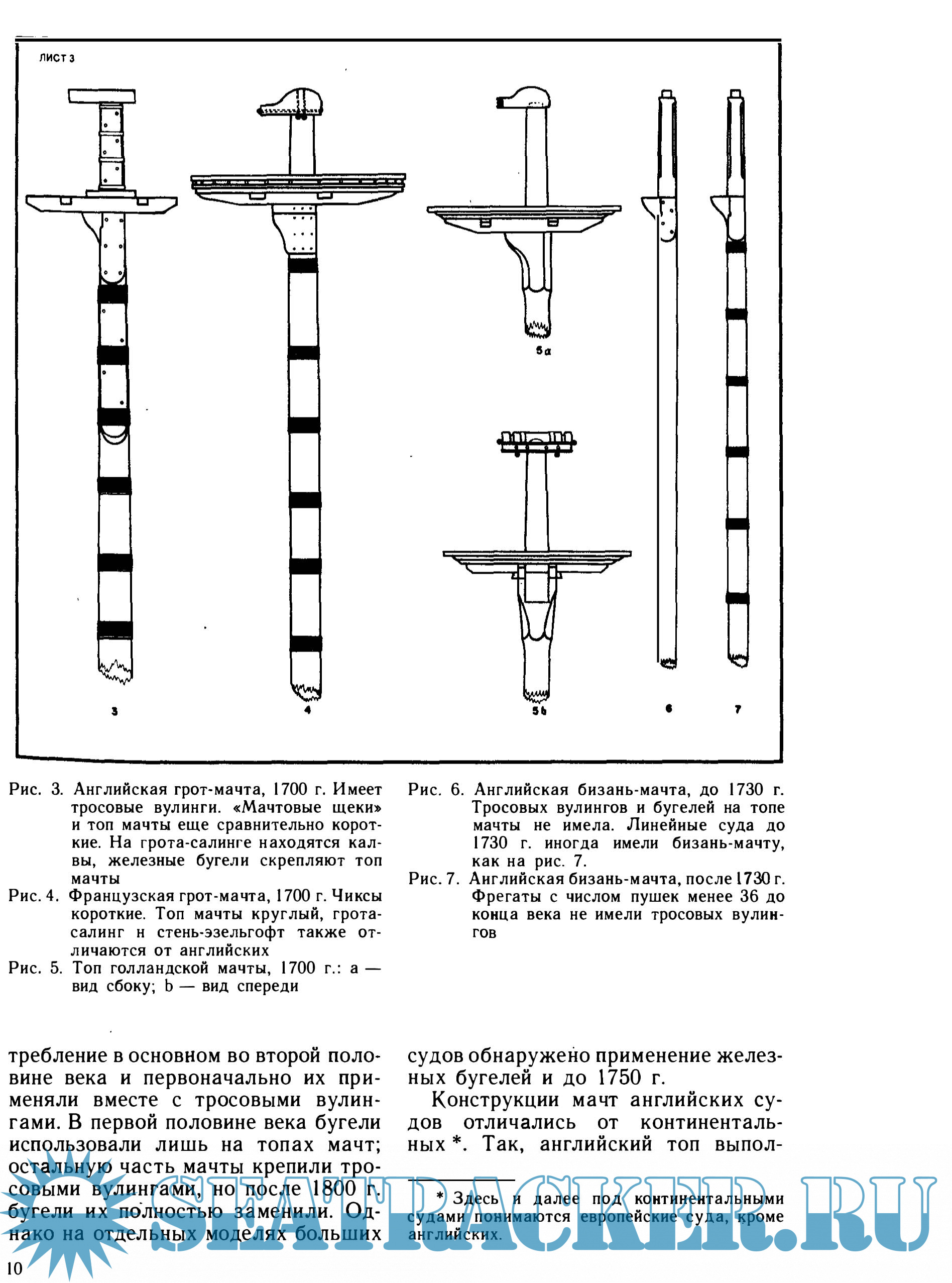 Чертежи корпусов судов XVI l l в., часто разработанные вплоть до деталей, для многих судов и сейчас сохранились в оригиналах. Сведения же о парусном вооружении можно получить лишь из некоторых общих обзорных рисунков и фрагментарных данных о деталях, выбранных из различных источников. Последние необходимо отыскать, изучить. и привести в соответствие для реконструкции планов вооружения различных судов.