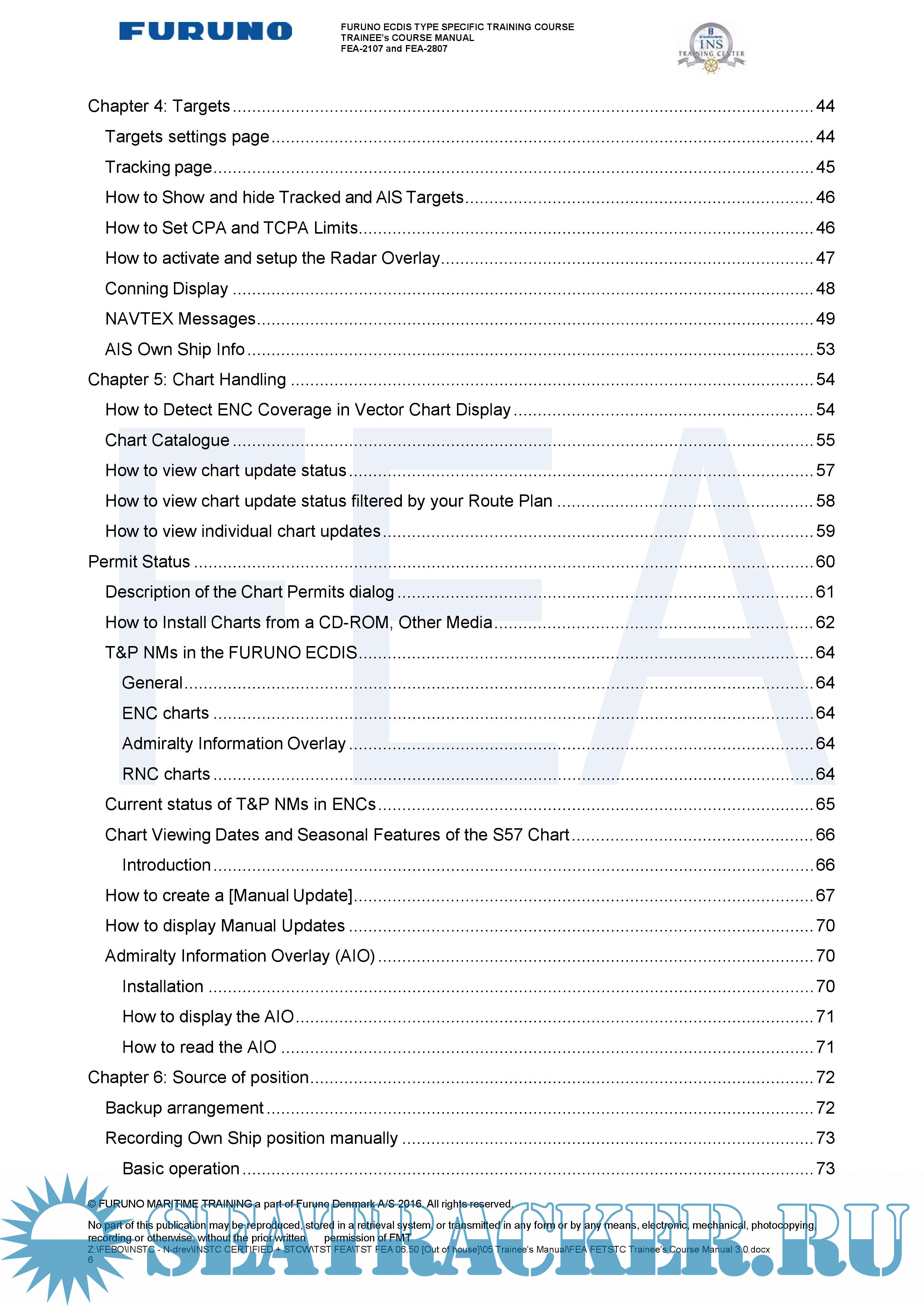 It should be used only to assist the trainee during the FURUNO ECDIS Training Course and as an additional guide during daily operations.