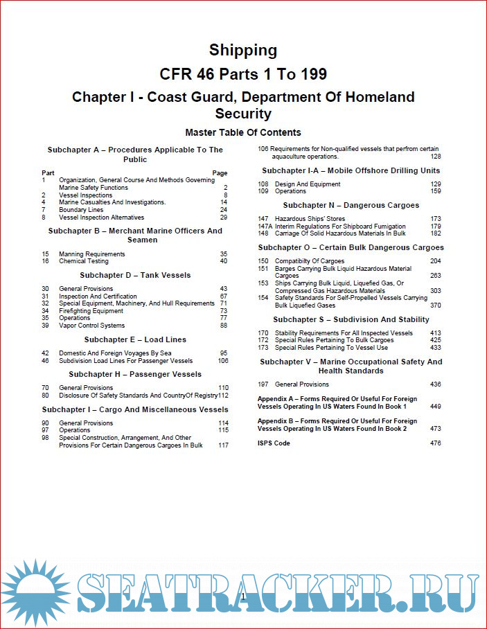 Year: 2018 Language: english Author: USCG Genre: Guide Publisher: CG Publications Format: PDF Quality: eBook Pages count: 543 Description: The 2017/2018 edition of the CG 515 + is a compilation of applicable Title 33 CFR and Title 46 CFR regulations pertaining to foreign vessels operating in the navigable waters of the United States.The information contained in the two volume “Foreign Vessel Rules” was obtained directly from U.S. Government sources available to the public. Changes and updates have been applied through the date printed on the cover.The format for the CG 515 + is as follows: Book 2: CFR 46 Shipping: ➢ Current regulations of the United States Coast Guard, Department of Transportation pertaining to Shipping. ➢ Appendix A – Forms required or otherwise useful for foreign vessels operating in U.S. waters from Book 1. ➢ Appendix B – Forms required or otherwise useful for foreign vessels operating in U.S. waters from Book 2. ➢ ISPS Code and Maritime Transportation Security Act. Additional info: A compilation of applicable CFR 33 & 46 regulations pertaining to Foreign Vessels Operating in the Navigable waters of the United States. +Plus Sub Chapter for Maritime Security Rules and Regulations from the Department of Homeland Security 2017/2018