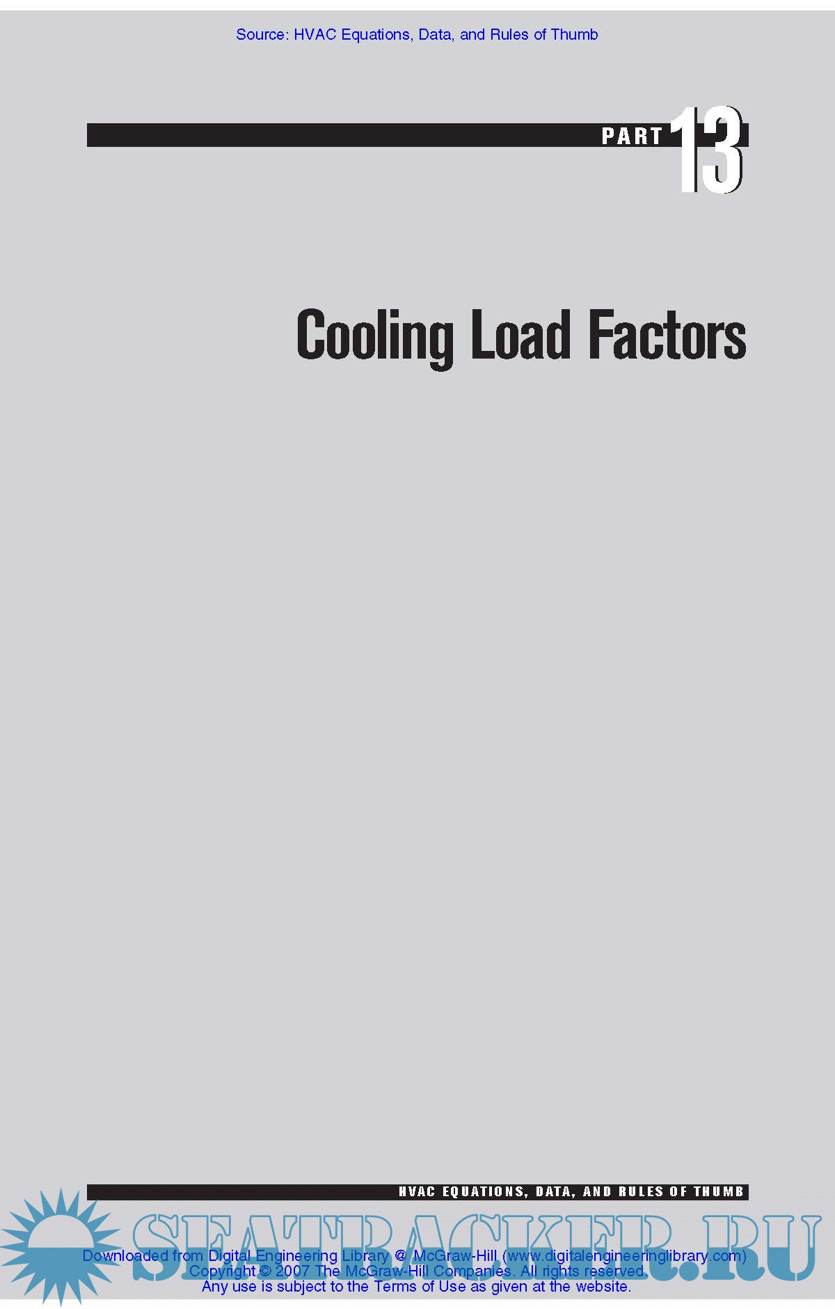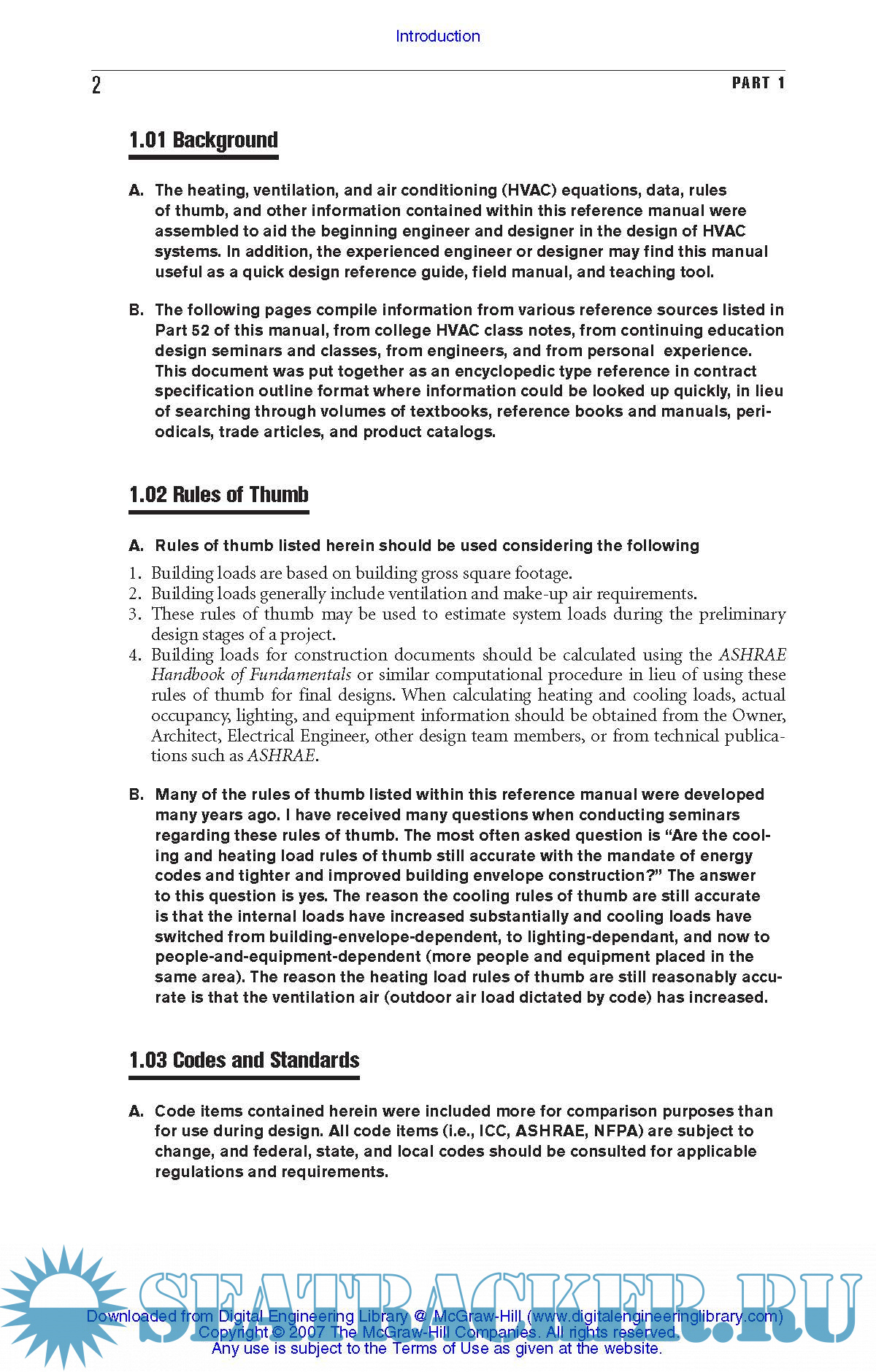 Table of Contents 1. Part 1: Introduction 2. Part 2: Definitions 3. Part 3: Equations 4. Part 4: Conversion Factors 5. Part 5: Cooling Load Rules of Thumb 6. Part 6: Heating Load Rules of Thumb 7. Part 7: Infiltration Rules of Thumb 8. Part 8: Ventilation Rules of Thumb 9. Part 9: Humidification Rules of Thumb 10. Part 10: People/Occupancy Rules of Thumb 11. Part 11: Lighting Rules of Thumb 12. Part 12: Appliance/Equipment Rules of Thumb 13. Part 13: Cooling Load Factors 14. Part 14: Heating Load Factors 15. Part 15: Design Conditions and Energy Conservation 16. Part 16: HVAC System Selection Criteria 17. Part 17: Air Distribution Systems 18. Part 18: Piping Systems, General 19. Part 19: Hydronic (Water) Piping Systems 20. Part 20: Glycol Piping Systems 21. Part 21: Steam Piping Systems 22. Part 22: Steam Condensate Piping Systems 23. Part 23: AC Condensate Piping 24. Part 24: Refrigerant Piping Systems 25. Part 25: Air Handling Units 26. Part 26: Fans 27. Part 27: Pumps 28. Part 28: Chillers 29. Part 29: Cooling Towers and Condensers 30. Part 30: Heat Exchangers 31. Part 31: Boilers 32. Part 32: Motors and Motor Controllers 33. Part 33: Humidifiers 34. Part 34: Filters 35. Part 35: Insulation 36. Part 36: Fire-Stopping and Through-Penetration Systems 37. Part 37: Makeup Water 38. Part 38: Water Treatment and Chemical Feed Systems 39. Part 39: Automatic Controls Building Automation Systems 40. Part 40: Equipment Schedules 41. Part 41: Equipment Manufacturers 42. Part 42: Building Construction Business Fundamentals 43. Part 43: Architectural, Structural, and Electrical Information 44. Part 44: Properties of Air 45. Part 45: Properties of Water 46. Part 46: Cleanroom Criteria 47. Part 47: Wind Chill and Heat Index 48. Part 48: Miscellaneous 49. Part 49: General Notes 50. Part 50: Designer's Checklist 51. Part 51: Professional Societies and Trade Organizations 52. Part 52: References and Design Manuals
