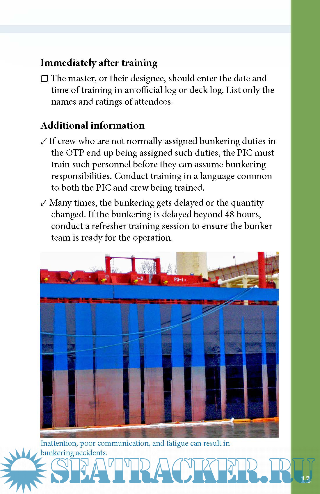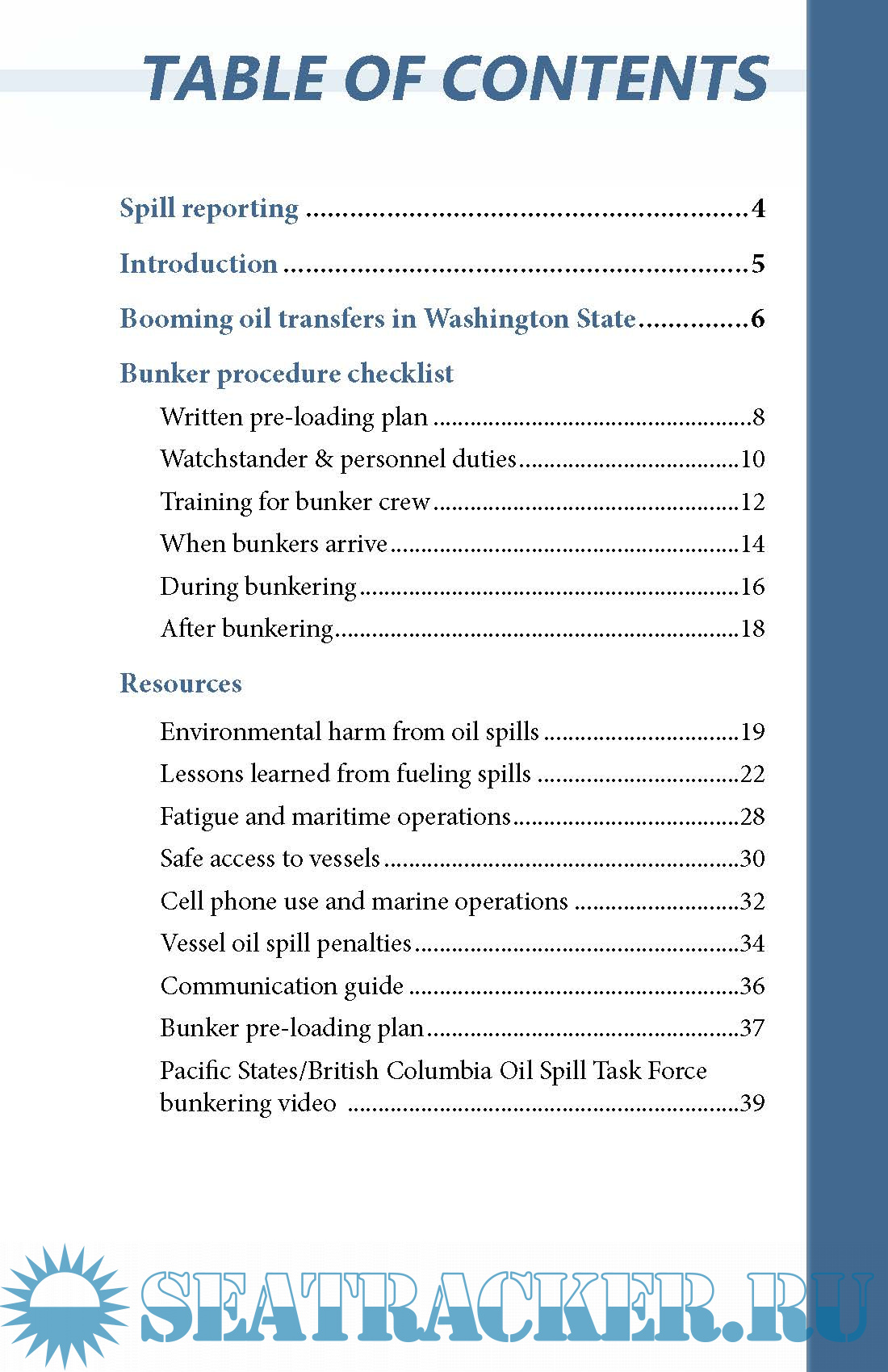 Year: 2014 Language: english Author: Sarah Thompson, Mike Lynch, Pacific States/British Columbia Oil Spill Task Force Genre: Manual Publisher: Department of Ecology State of Washington Edition: June 2017 Format: PDF Quality: eBook Pages count: 40 Description: This Bunkering Best Practices manual contains tips and best practices that can help you prevent oil spills and protect Washington’s environment, public health, safety, and economy. We encourage you to use this guide to develop your bunkering policies and train your crew in safe and effective practices. By using responsible oil transfer procedures, you can greatly reduce costly and dangerous spill incidents. The Washington State Department of Ecology regulates oil transfers over Washington waters to help prevent oil spills. The bunkering best practices checklists in this guide comply with the Washington State bunkering rule (Chapter 317-40 WAC). The checklists include the experience and knowledge of our spill prevention inspectors. Our inspectors have conducted and observed thousands of bunkering operations and reviewed many more vessel oil transfer/bunkering procedures. The practices highlighted in this manual are meant to create a spill prevention mindset during your bunkering operations. They do not replace your vessel’s procedures or the federal oil transfer requirements of the U.S. Coast Guard. Additional info: A video related to this manual can be downloaded from https://seatracker.club/viewtopic.php?t=4385