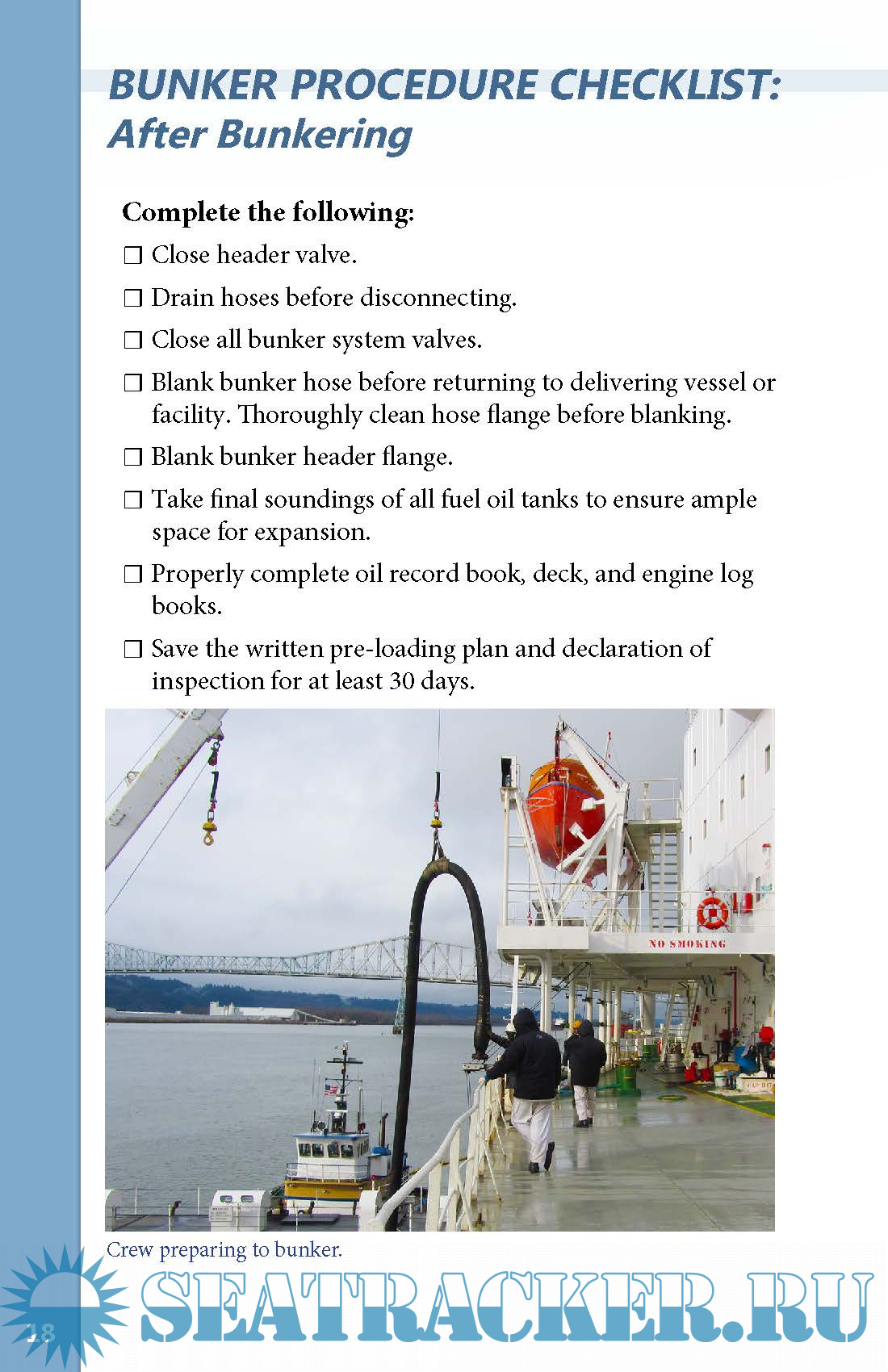The practices highlighted in this manual are meant to create a spill prevention mindset during your bunkering operations. They do not replace your vessel’s procedures or the federal oil transfer requirements of the U.S. Coast Guard.