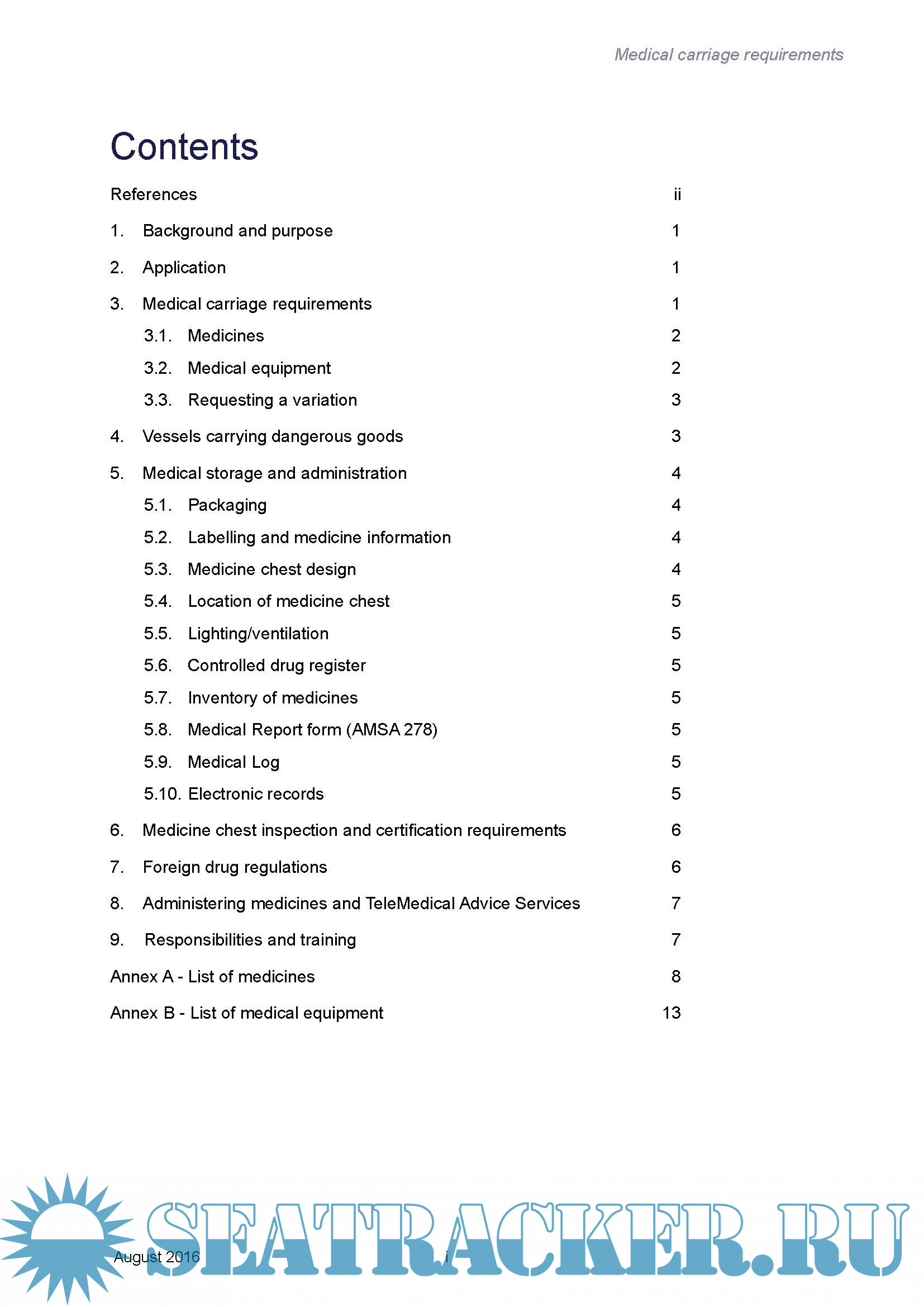 Year: 2016 Language: english Author: AMSA Genre: Guide Format: PDF Quality: eBook Pages count: 28 Description: Regulated Australian vessels must be equipped with a medicine chest that contains the medicines and medical equipment that would allow an appropriately trained person to treat injuries and illnesses on board the vessel until a patient can be transferred to the care of a medical practitioner. The information provided in this document is derived from international medical publications, in particular the International Medical Guide for Ships and its Quantification Addendum. Marine Order 11 requires that each regulated Australian vessel carries a copy of the most recent edition of the International Medical Guide for Ships to assist in the diagnosis and treatment of sick and injured seafarers.