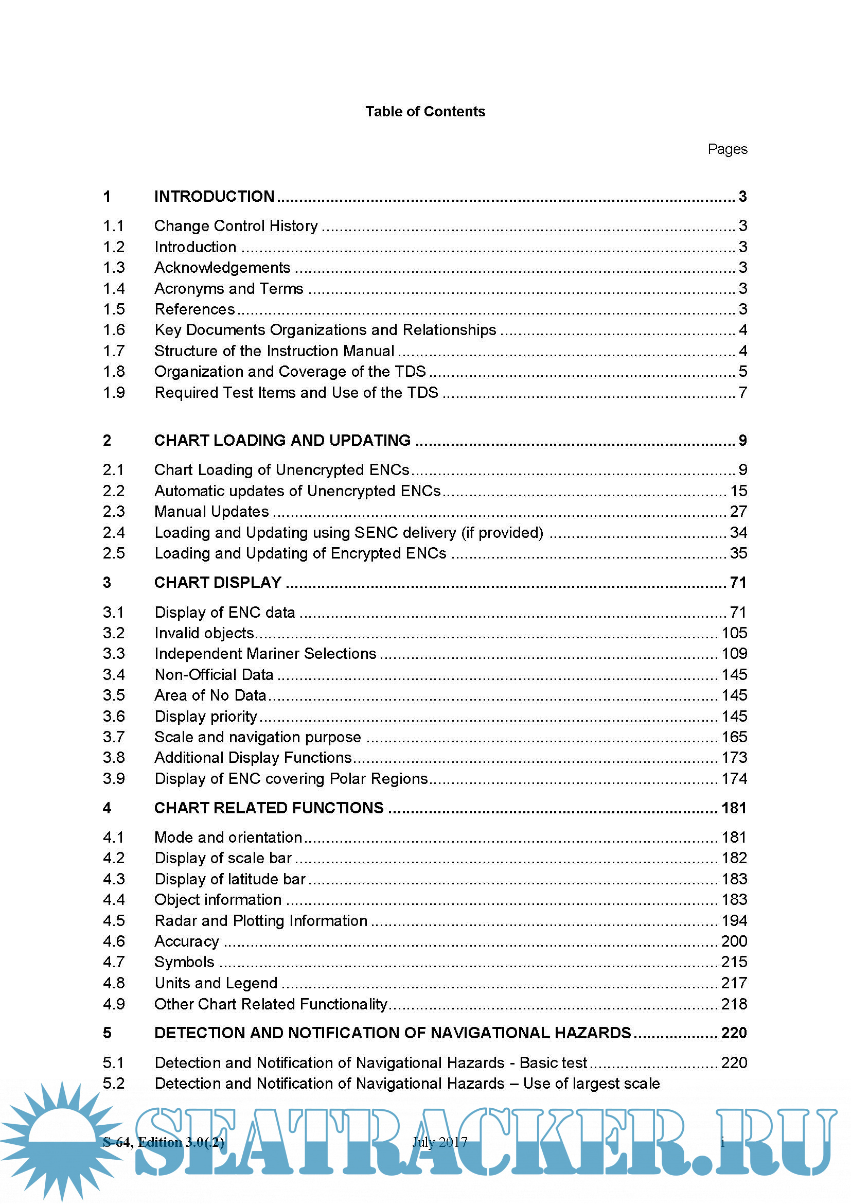 Year: 2017 Language: english Author: IHO Genre: Technical book Format: PDF Quality: eBook Pages count: 256 Description: The International Hydrographic Organization (IHO) Test Data Sets (TDS) for Electronic Chart and Display Information System (ECDIS) have been produced to fulfil the requirement for a data set necessary to accomplish all ECDIS testing requirements as outlined in the IEC 61174 standard. The TDS has been published as IHO Publication Number 64 and consists of numerous data sets required for testing as well as this guide, the TDS Instruction Manual (TIM). The TIM provides supporting documentation about the organization, understanding, and use of the ENC TDS and is intended to be used along with the data sets included in the TDS. It aims to provide appropriate comments about each test including the information about the most suitable data elements, their location and the expected test results.