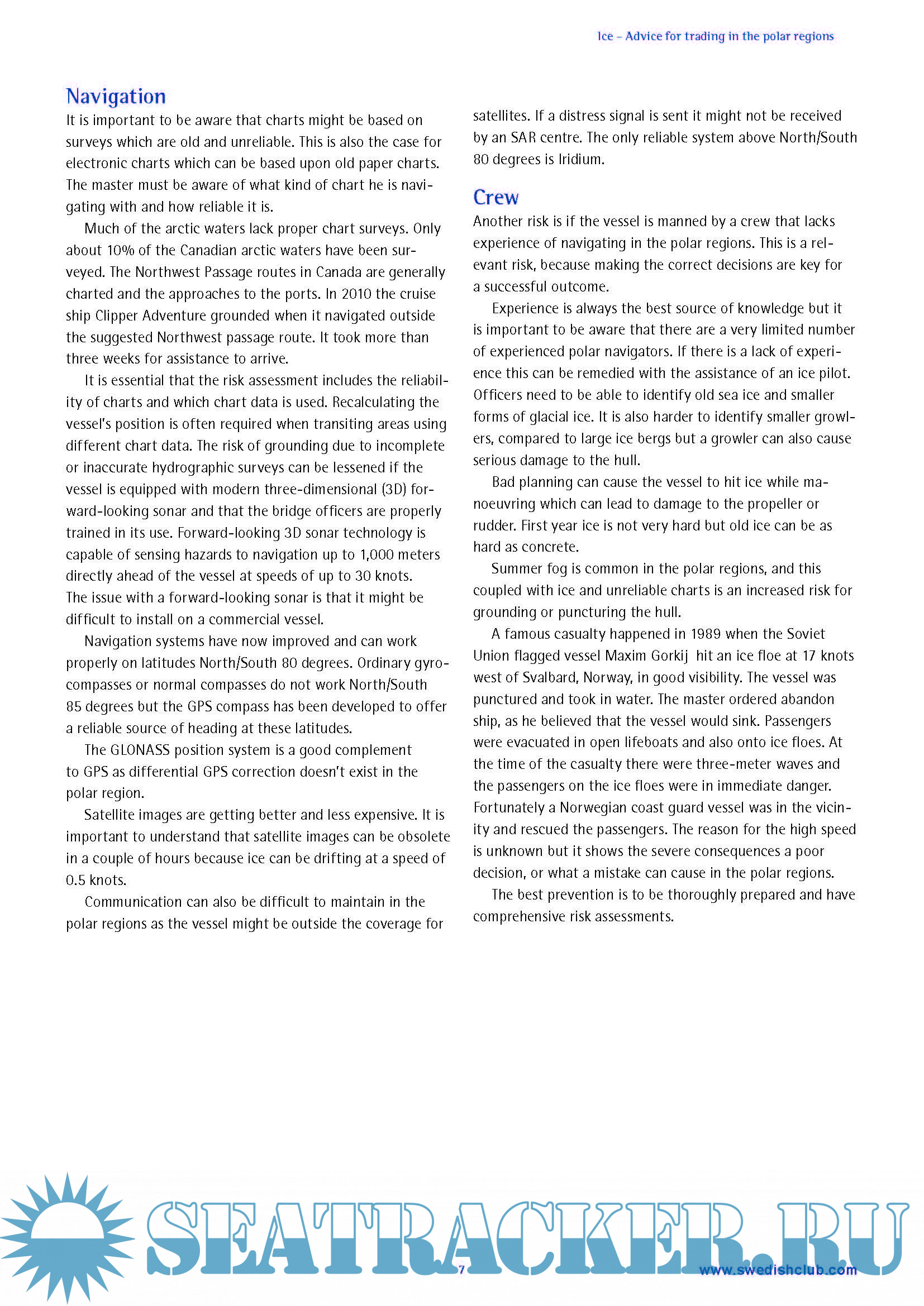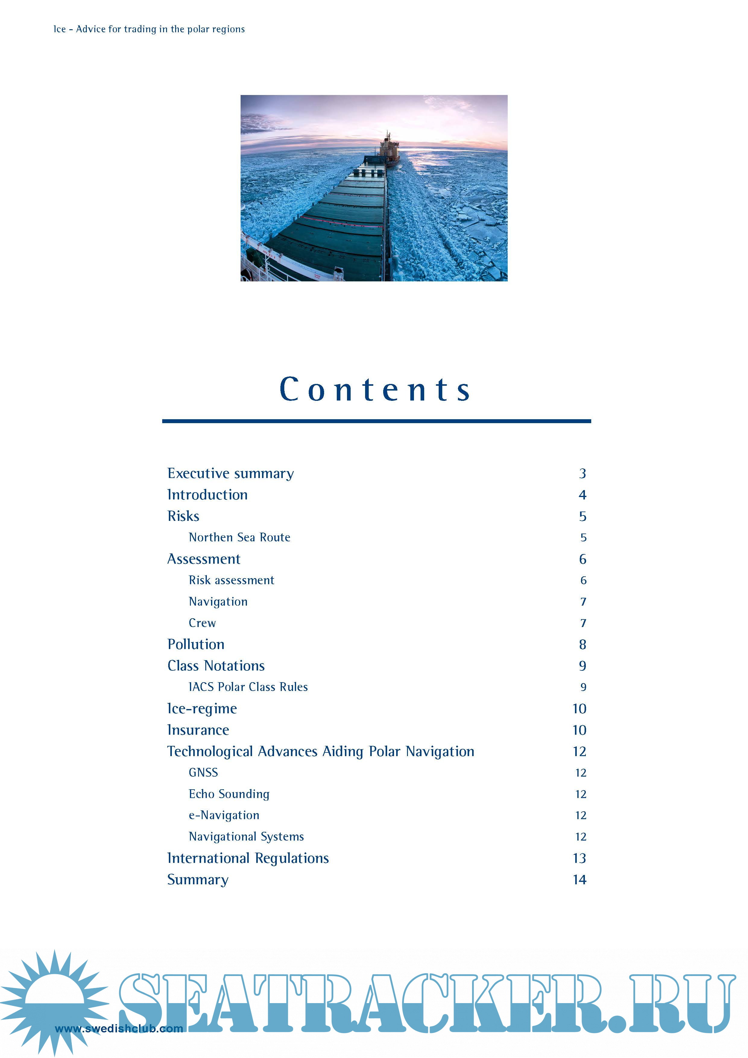 Year: 2014 Language: english Author: Swedish P&I Club Genre: Guide Format: PDF Quality: eBook Pages count: 16 Description: The wealth of natural resources in the arctic region is enormous. It is believed that up to a quarter of the world’s undiscovered, recoverable hydrocarbon reserves are in the arctic seabed. There are also huge additional iron, gold, zinc and diamond deposits which will become more accessible if the arctic ice continues to diminish. Shipping activity in the polar regions is a complicated endeavour. It seems that longer ice-free summers in the arctic are making operations in the polar regions more accessible in combination with the development of new technology. What seemed impossible before because of the rough weather and thick ice is now becoming possible. This activity will probably increase even further in the future because the search for natural resources such as oil, gas and metals is unlikely to stop. Much of the increased activity in the polar regions will be from offshore operations traffic involved in exploration and extraction of oil and gas. This will increase transports from and to the arctic ports in the region. The polar regions consist of the Arctic and Antarctic.