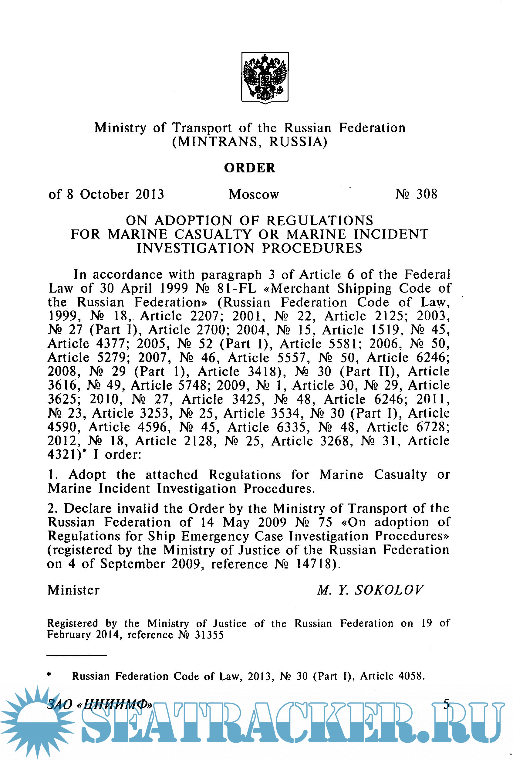 The publication contains the Regulation on the investigation of accidents or incidents at sea, approved by Order No. 308 of 08.10.13 of the Ministry of Transport of the Russian Federation, registered in the Ministry of Justice of Russia on February 19, 1943 No. 31355.
