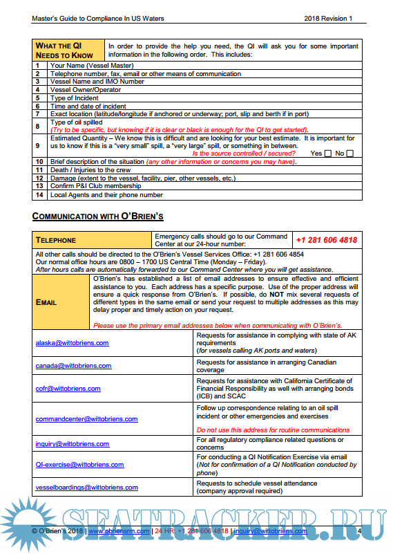 Description: This is a practical guide for Masters to assist in compliance with US laws and regulations. It is not an “official” document and is not required for compliance. It is intended to provide useful direction for Masters. It does not replace any document required by law or regulation. It does not replace direction provided by the ship’s owner/manager/operator. This guide may be modified as required to be in harmony with policies of the owner/manager/operator. Questions about this guide should be directed to O’Brien’s at [email protected]