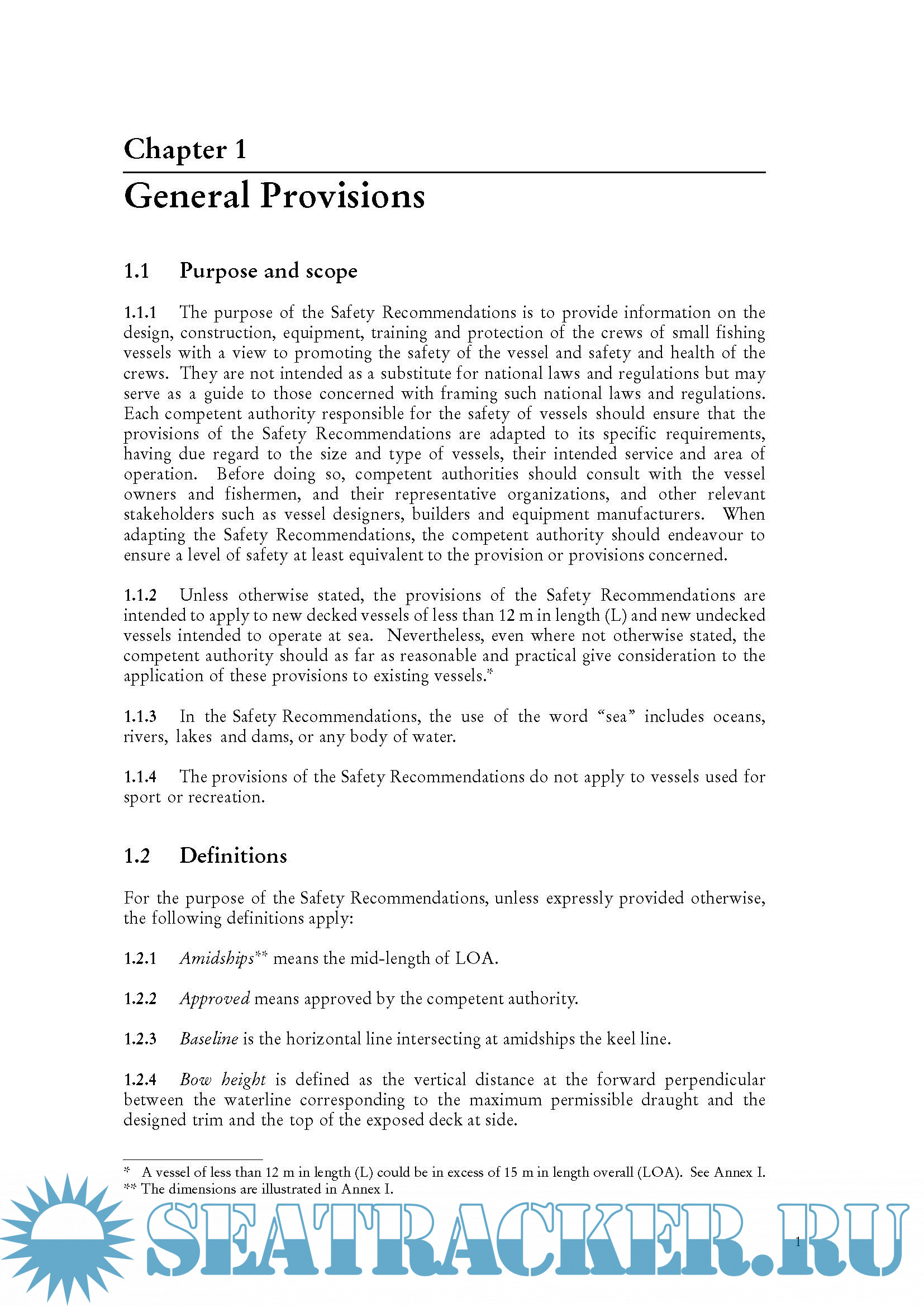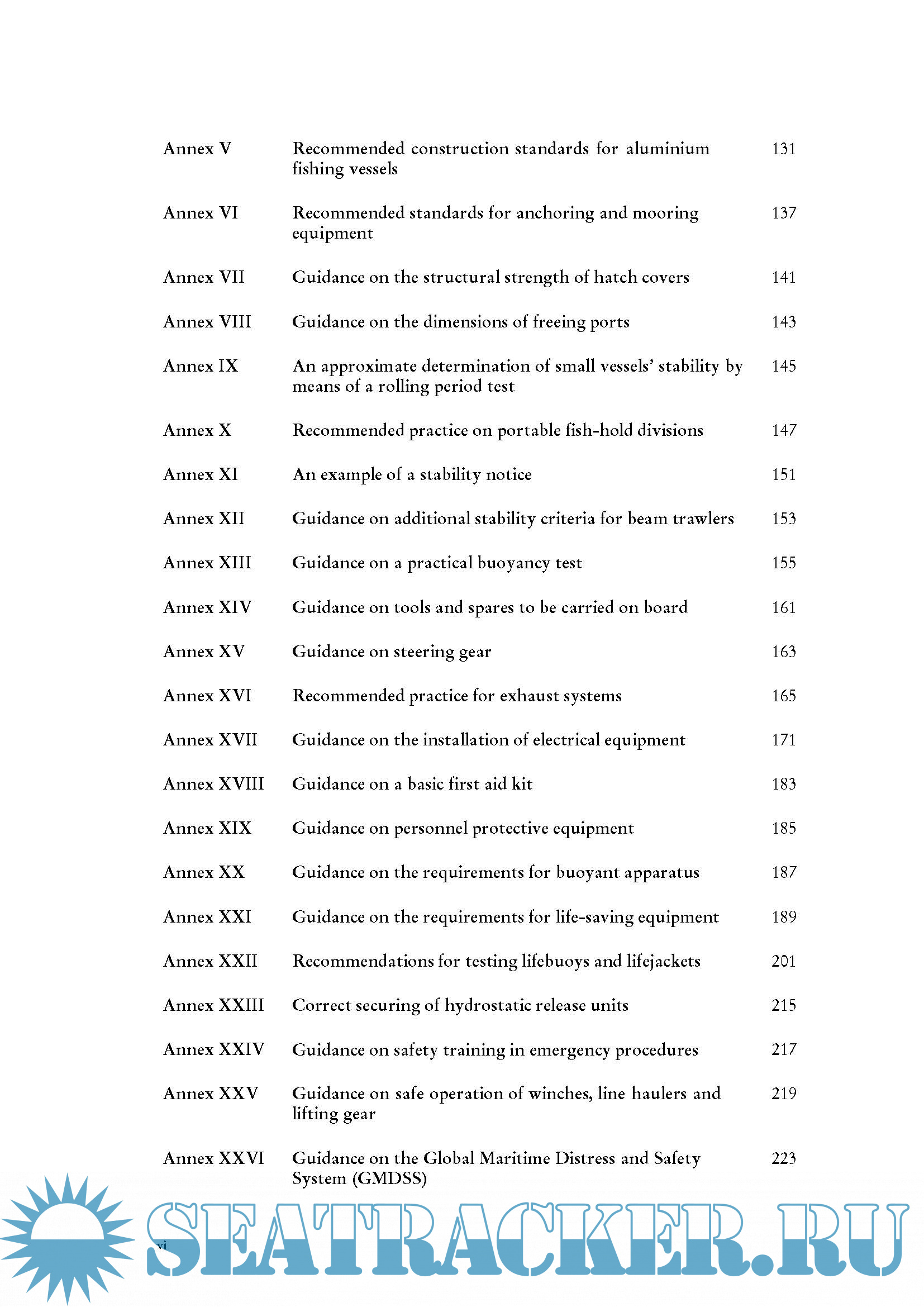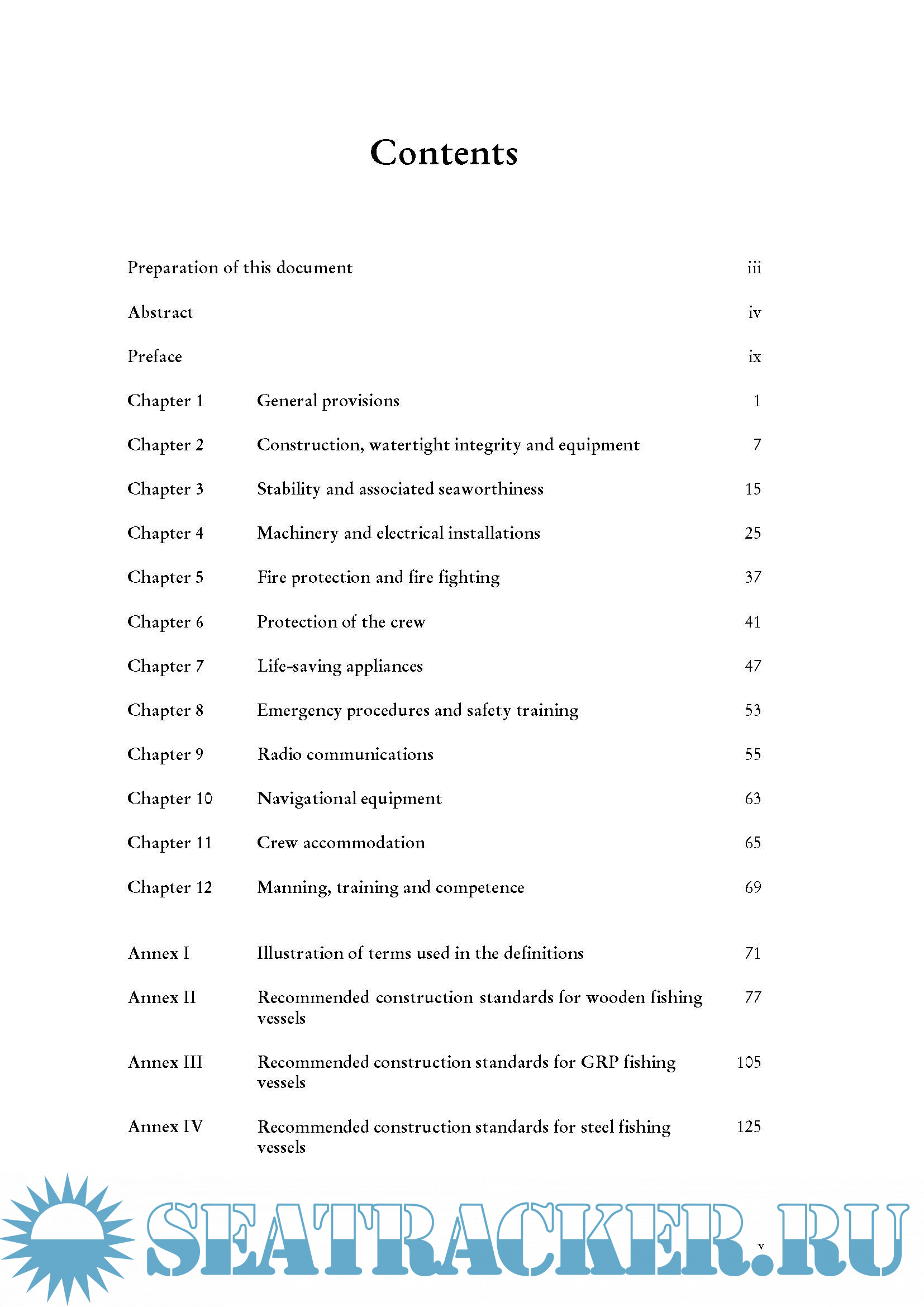 Year: 2012 Language: english Author: FAO/ILO/IMO Genre: Guide Edition: 2012 ISBN: 978-92-5-107397-1 Format: PDF Quality: eBook Pages count: 267 Description: The purpose of the Safety Recommendations contained in this publication is to provide information on the design, construction, equipment, training and protection of the crews of small fishing vessels with a view to promoting the safety of the vessel and the safety and health of the crews. These Safety Recommendations may also serve as a guide for those concerned with the safety of vessels used in support of aquaculture activities. The publication includes recommendations on watertight integrity and equipment, stability and associated seaworthiness, machinery and electrical installations, fire protection and fire-fighting, protection of the crew, life-saving appliances, emergency procedures and safety training, radio communication, navigational equipment, crew accommodation, and manning training and competence. While not intended as a substitute for national laws and regulations these recommendations may serve as a guide to those persons concerned with framing such national laws and regulations. Unless otherwise stated, the provisions of these Safety Recommendations are intended to apply to new decked vessels of less than 12 m in length and new undecked vessels intended to operate at sea (as well as on oceans, rivers, lakes and dams, or on any body of water).