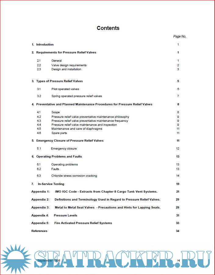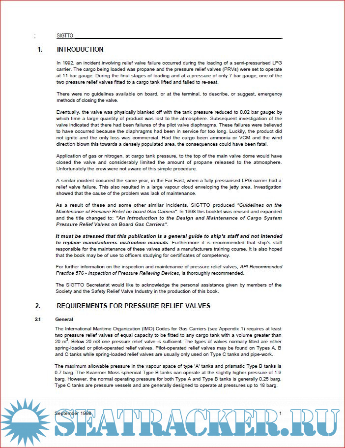 Year: 2014 Language: english Author: SIGTTO Genre: Guide Publisher: Witherby Publishing Group Ltd Edition: 2nd ISBN: 978-1-85609-163-3 Format: PDF Quality: Scanned pages Pages count: 34 Description: This book was written following an incident in 1992 that involved failure of a relief valve when a semi-pressurised LPG carrier was being loaded. The cargo being loaded was propane, and the pressure relief valves PRVs were set to operate at 11 bar gauge. During the final stages of loading at a pressure of 7 bar gauge, one of the pressure relief valves fitted to a cargo tank failed. There were no guidelines available on board or at the terminal to provide any assistance in the emergency methods for closing the valve. The valve was eventually blanked off with the tank pressure reduced to 0.02 bar gauge, but by this time a large amount of the product had been lost into the atmosphere. The investigation that followed discovered that there was a failure of the pilot valve diaphragm, possibly due to the diaphragms being in service for too long. Additional info:The book advises on PRV maintenance and testing, emergency closure, and operating problems and faults. It is a general guide for the ship’s staff and is not designed to replace the manufacturers’ instruction manuals. The purpose of SIGTTO is to promote shipping and terminal operations for liquefied gases which are safe, environmentally responsible and reliable. To fulfil this mission it will: -Proactively develop best operating practices and guideline -Sustain a learning environment by sharing lessons learned -Promote training and development of all within the industry -Foster mutually beneficial relationships with regulatory authorities and other stakeholders -Conduct its business with professionalism and integrity