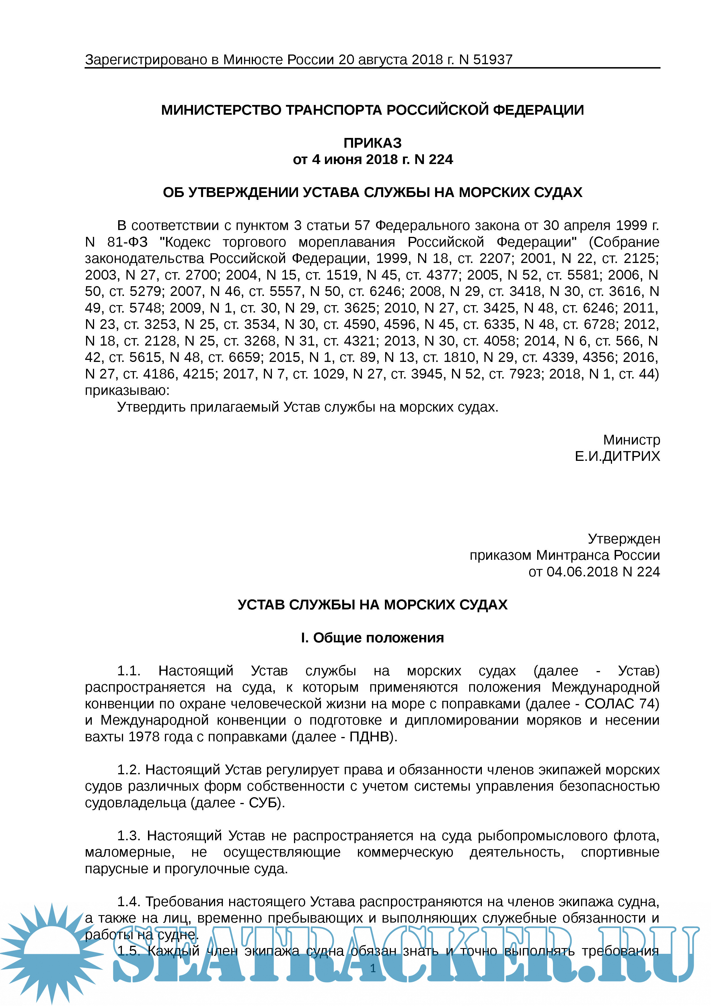 Приказ Минтранса России от 04.06.2018 N 224 "Об утверждении Устава службы на морских судах"