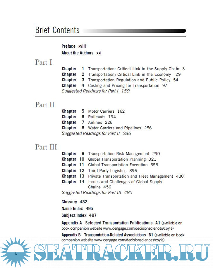 Year: 2011 Language: english Author: John Coyle Genre: Textbook Publisher: South - Western Cengage Learning Edition: Seventh ISBN: 032478919X Format: PDF Quality: eBook Pages count: 533 Description: The book aims at helping readers understand the fundamental role and importance of transportation in companies and in society, as well as the complex environment in which transportation service is provided today. The text examines domestic and international transportation systems--and their legal issues--to give readers a thorough, easy-to-understand overview. Packed with real-world insight, the book equips you with the tools you need to succeed in this fast-paced and rapidly changing industry.