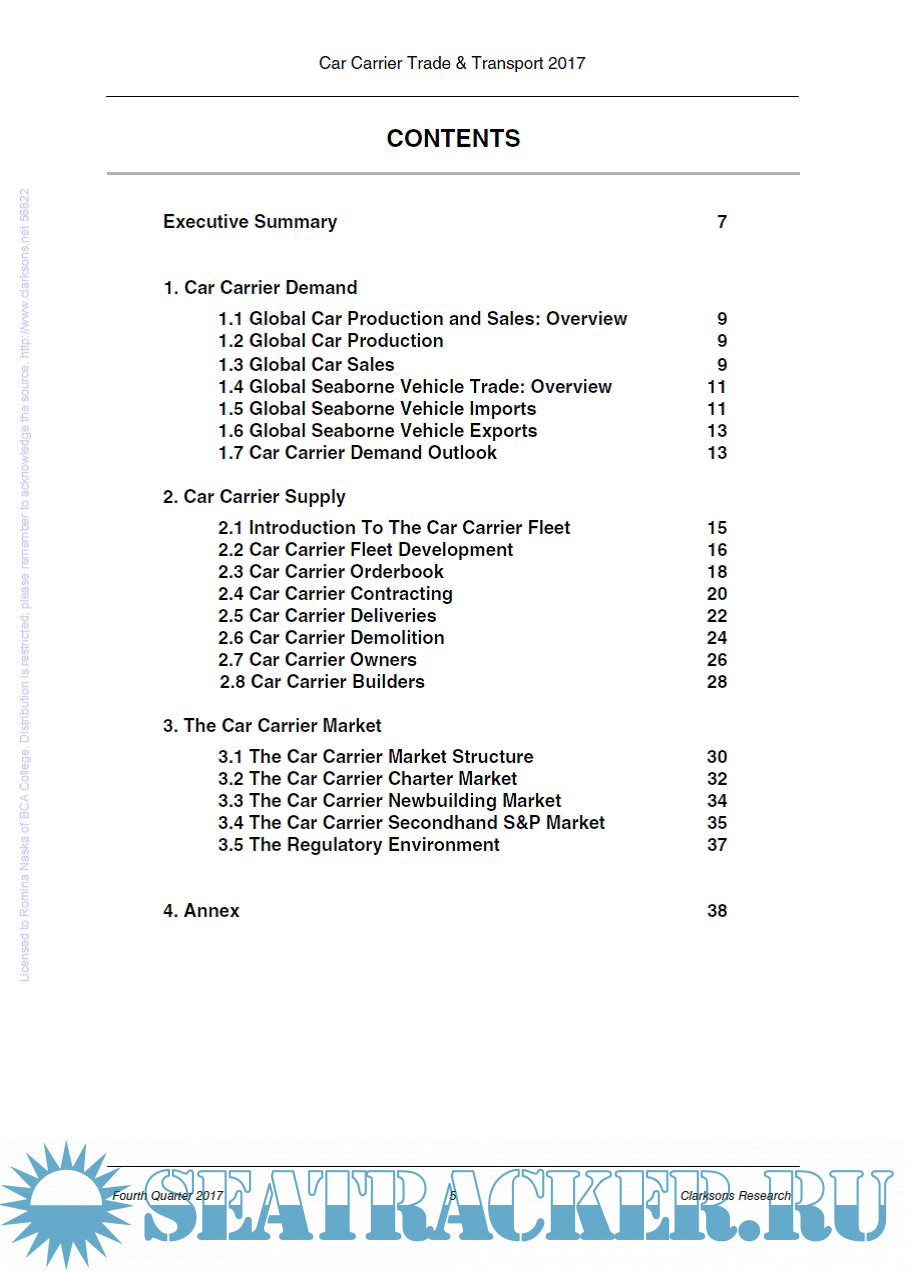 Description: This report was prepared by Clarkson Research Services Limited to provide a briefing on the organization and economic structure of the Car-Carrier segment of the shipping industry. It uses statistical data as of start of November 2017 and the basic maritime economic theory to support the analysis and draw useful conclusions about the Car-Carrier shipping-market segment outlook.