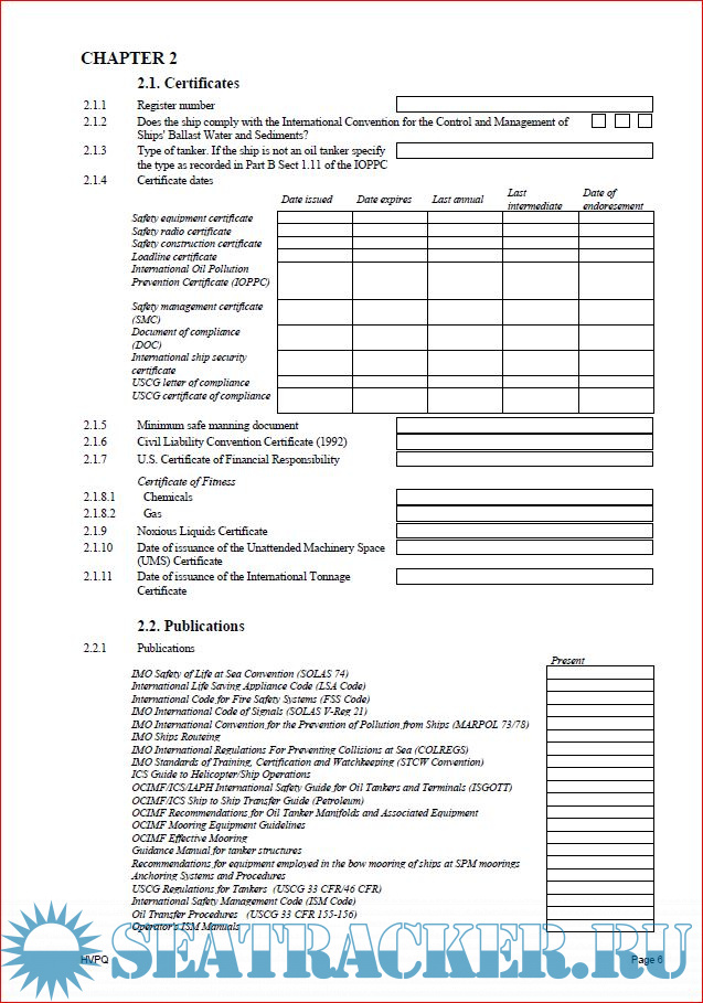 1. General Information 2. Certificates 3. Crew Management 4. Navigation 5. Safety Management 6. Pollution Prevention 7. Structural Condition 8. Ballast Tanks 9. LPG Tanker Information 10. Mooring 11. Communications and Electronics 12. Main Propulsion 13. Ship to Ship Transfer 14. Combination Carriers