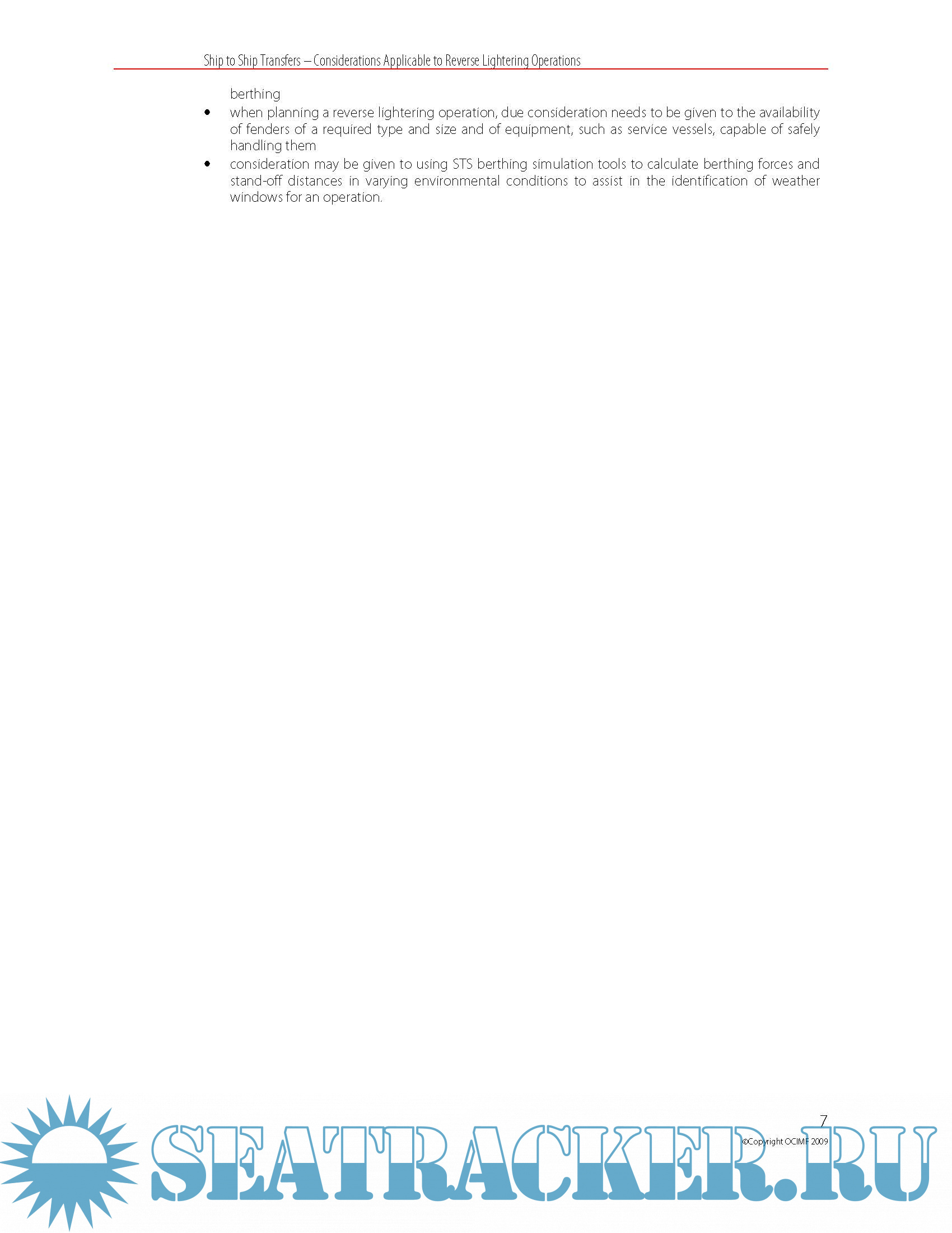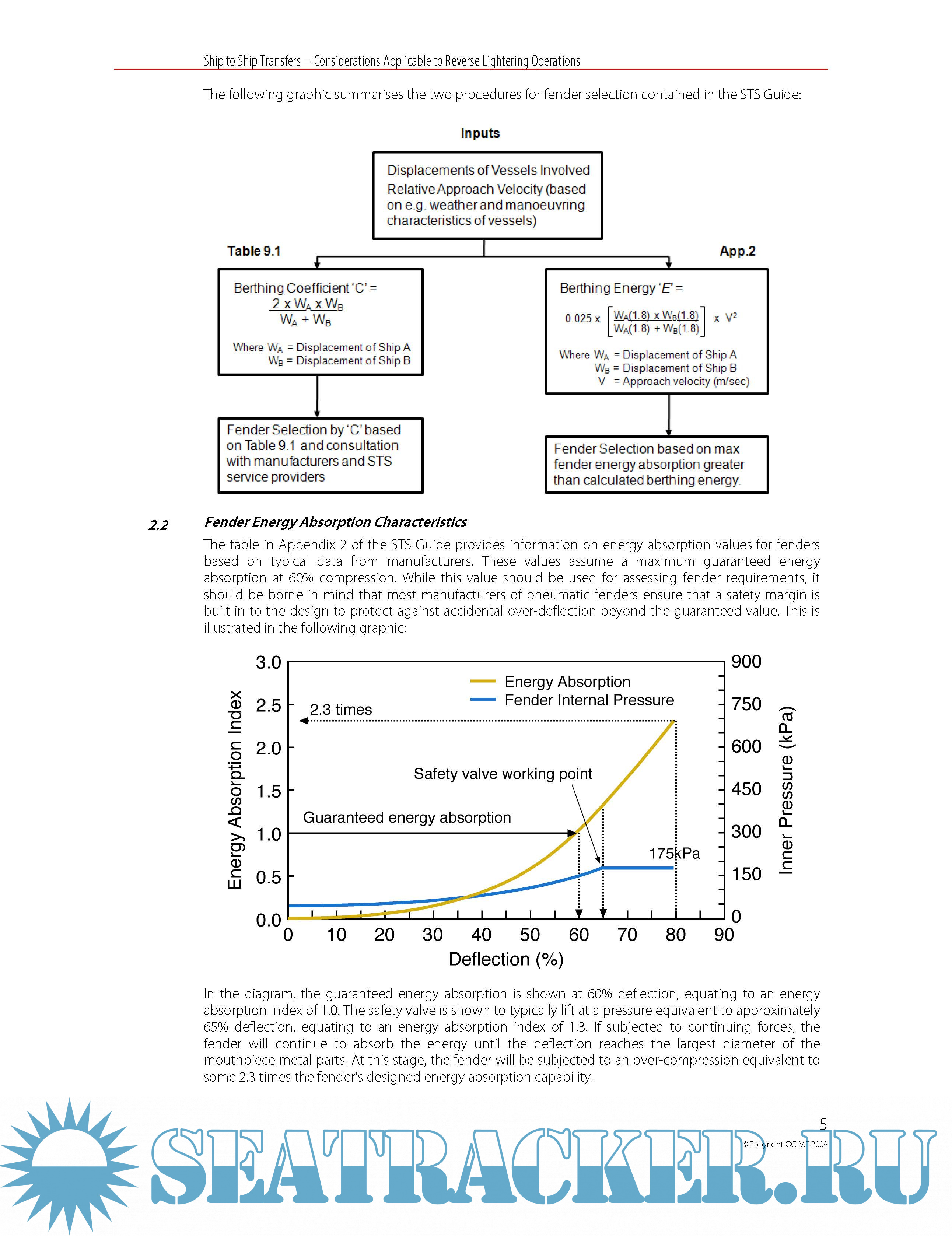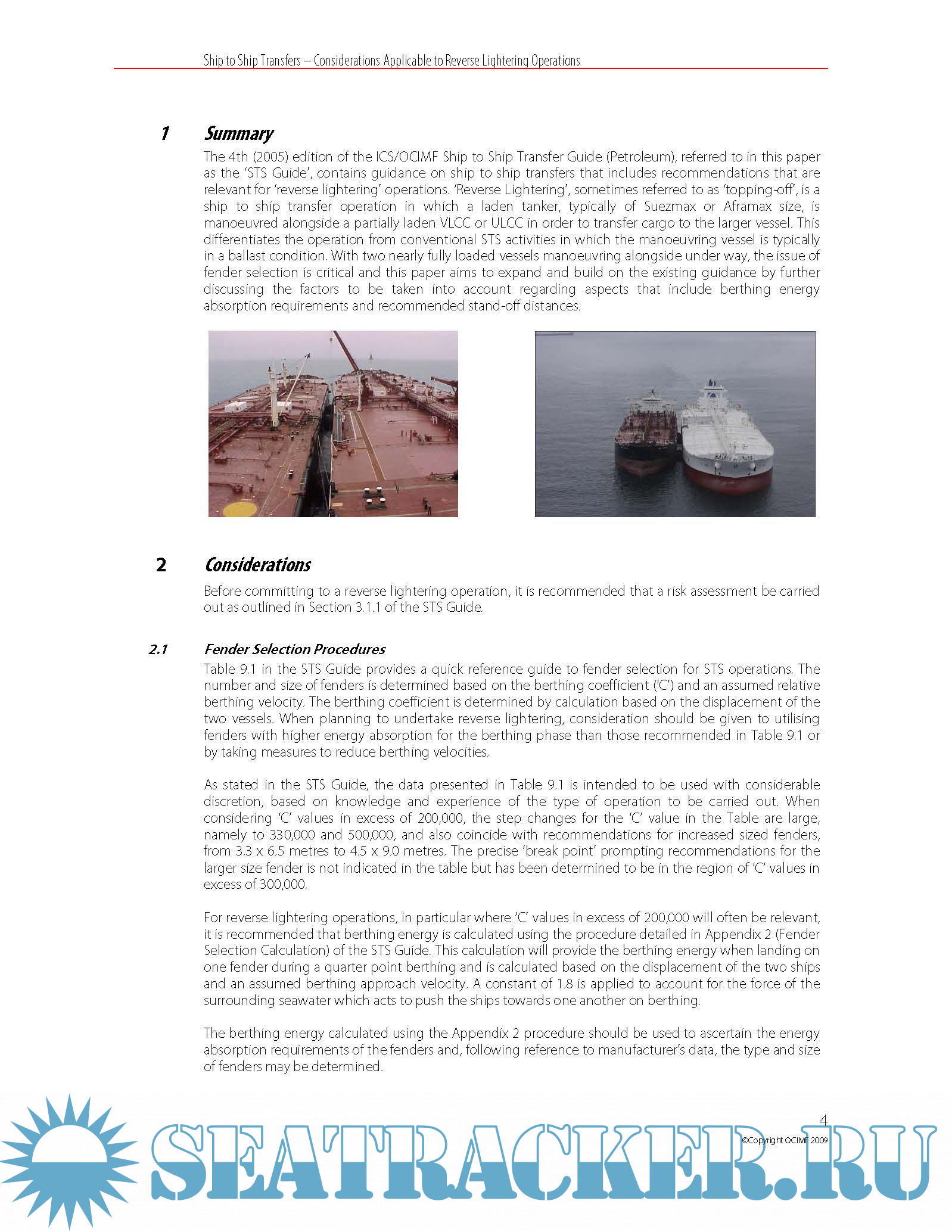 Year: 2009 Language: english Author: OCIMF Genre: Guide Format: PDF Quality: eBook Pages count: 7 Description: ‘Reverse Lightering’, sometimes referred to as ‘topping-off’, is a ship to ship transfer operation in which a laden tanker, typically of Suezmax or Aframax size, is manoeuvred alongside a partially laden VLCC or ULCC in order to transfer cargo to the larger vessel. This differentiates the operation from conventional STS activities in which the manoeuvring vessel is typically in a ballast condition. With two nearly fully loaded vessels manoeuvring alongside under way, the issue of fender selection is critical and this paper aims to expand and build on the existing guidance by further discussing the factors to be taken into account regarding aspects that include berthing energy absorption requirements and recommended stand-off distances.