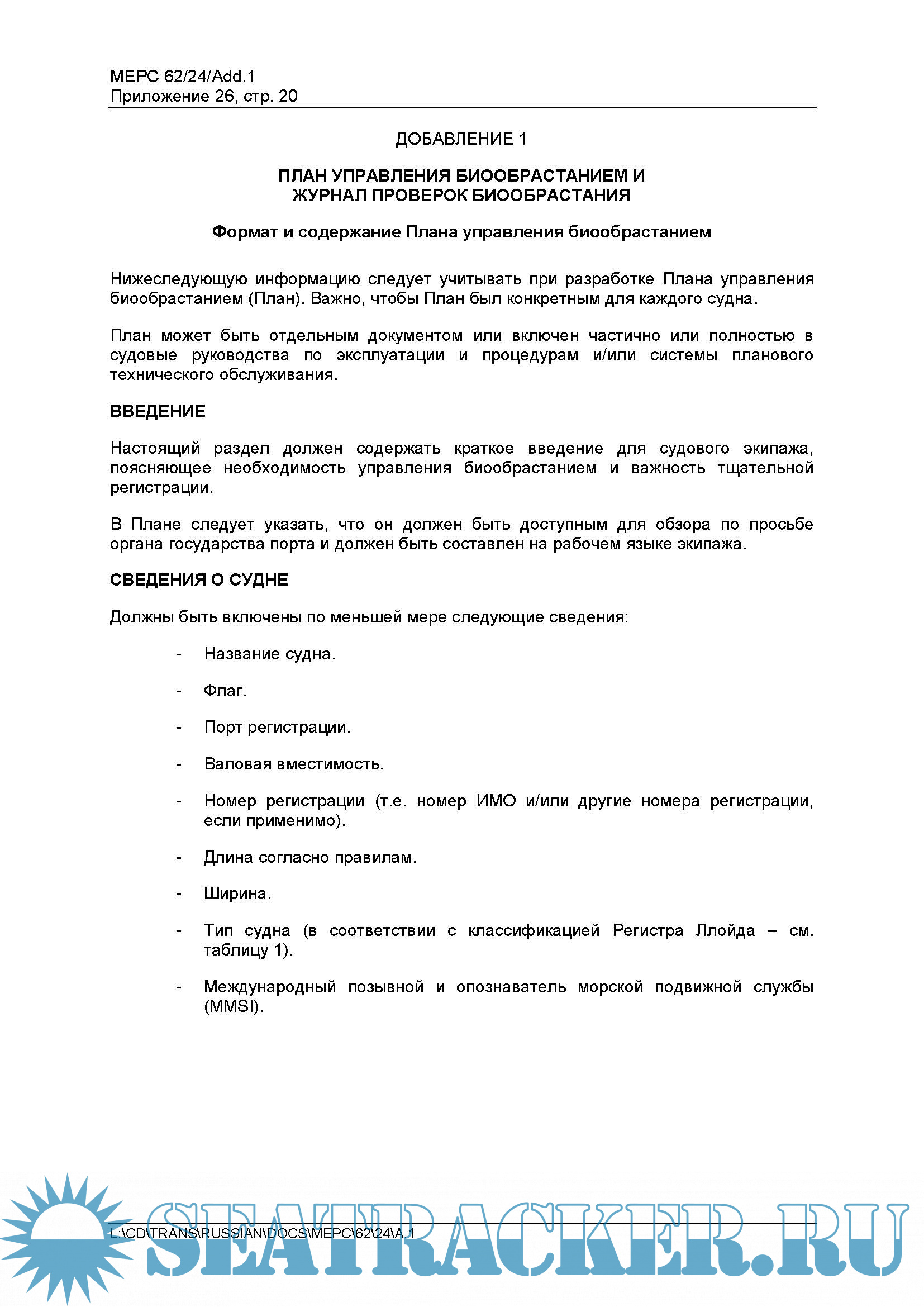 ДОБАВЛЕНИЕ 1 ПЛАН УПРАВЛЕНИЯ БИООБРАСТАНИЕМ И ЖУРНАЛ ПРОВЕРОК БИООБРАСТАНИЯ