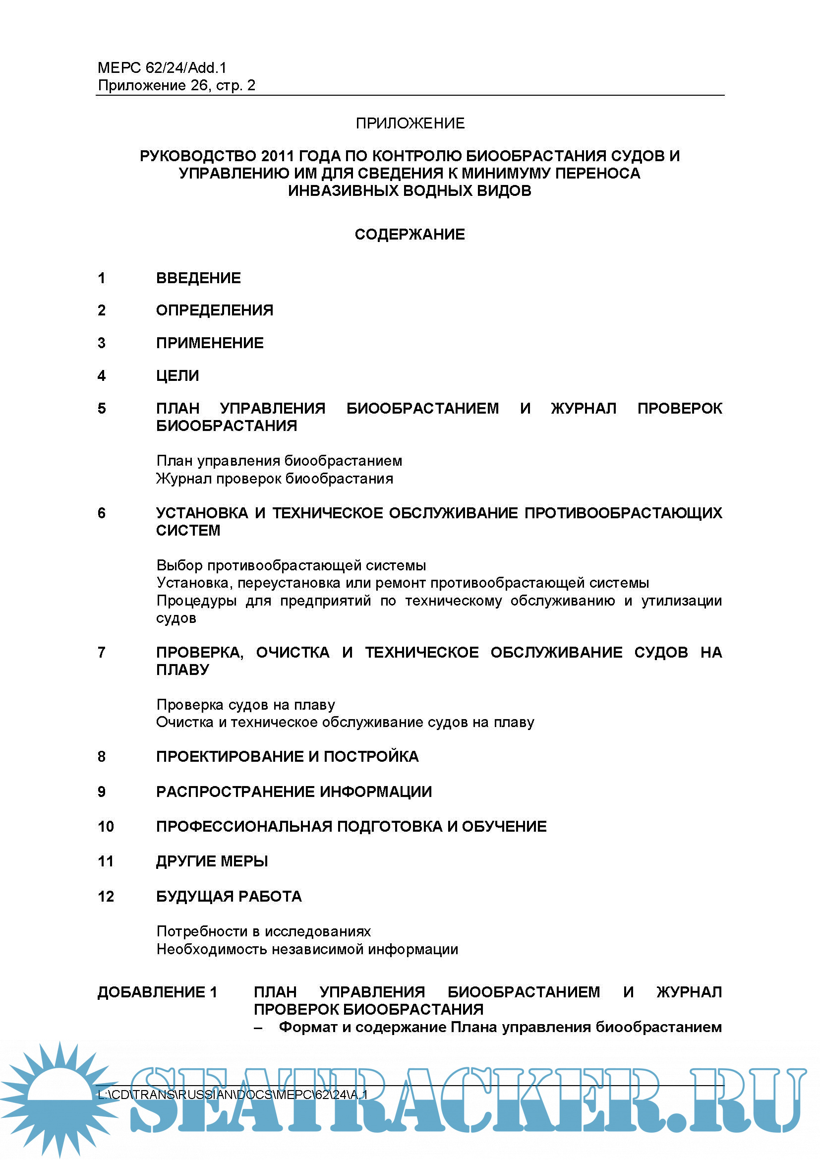 1 ВВЕДЕНИЕ 2 ОПРЕДЕЛЕНИЯ 3 ПРИМЕНЕНИЕ 4 ЦЕЛИ 5 ПЛАН УПРАВЛЕНИЯ БИООБРАСТАНИЕМ И ЖУРНАЛ ПРОВЕРОК БИООБРАСТАНИЯ План управления биообрастанием Журнал проверок биообрастания 6 УСТАНОВКА И ТЕХНИЧЕСКОЕ ОБСЛУЖИВАНИЕ ПРОТИВООБРАСТАЮЩИХ СИСТЕМ Выбор противообрастающей системы Установка, переустановка или ремонт противообрастающей системы Процедуры для предприятий по техническому обслуживанию и утилизации судов 7 ПРОВЕРКА, ОЧИСТКА И ТЕХНИЧЕСКОЕ ОБСЛУЖИВАНИЕ СУДОВ НА ПЛАВУ Проверка судов на плаву Очистка и техническое обслуживание судов на плаву 8 ПРОЕКТИРОВАНИЕ И ПОСТРОЙКА 9 РАСПРОСТРАНЕНИЕ ИНФОРМАЦИИ 10 ПРОФЕССИОНАЛЬНАЯ ПОДГОТОВКА И ОБУЧЕНИЕ 11 ДРУГИЕ МЕРЫ 12 БУДУЩАЯ РАБОТА Потребности в исследованиях Необходимость независимой информации ДОБАВЛЕНИЕ 1 ПЛАН УПРАВЛЕНИЯ БИООБРАСТАНИЕМ И ЖУРНАЛ ПРОВЕРОК БИООБРАСТАНИЯ – Формат и содержание Плана управления биообрастанием ДОБАВЛЕНИЕ 2 ПЛАН УПРАВЛЕНИЯ БИООБРАСТАНИЕМ И ЖУРНАЛ ПРОВЕРОК БИООБРАСТАНИЯ – Форма Журнала проверок биообрастания