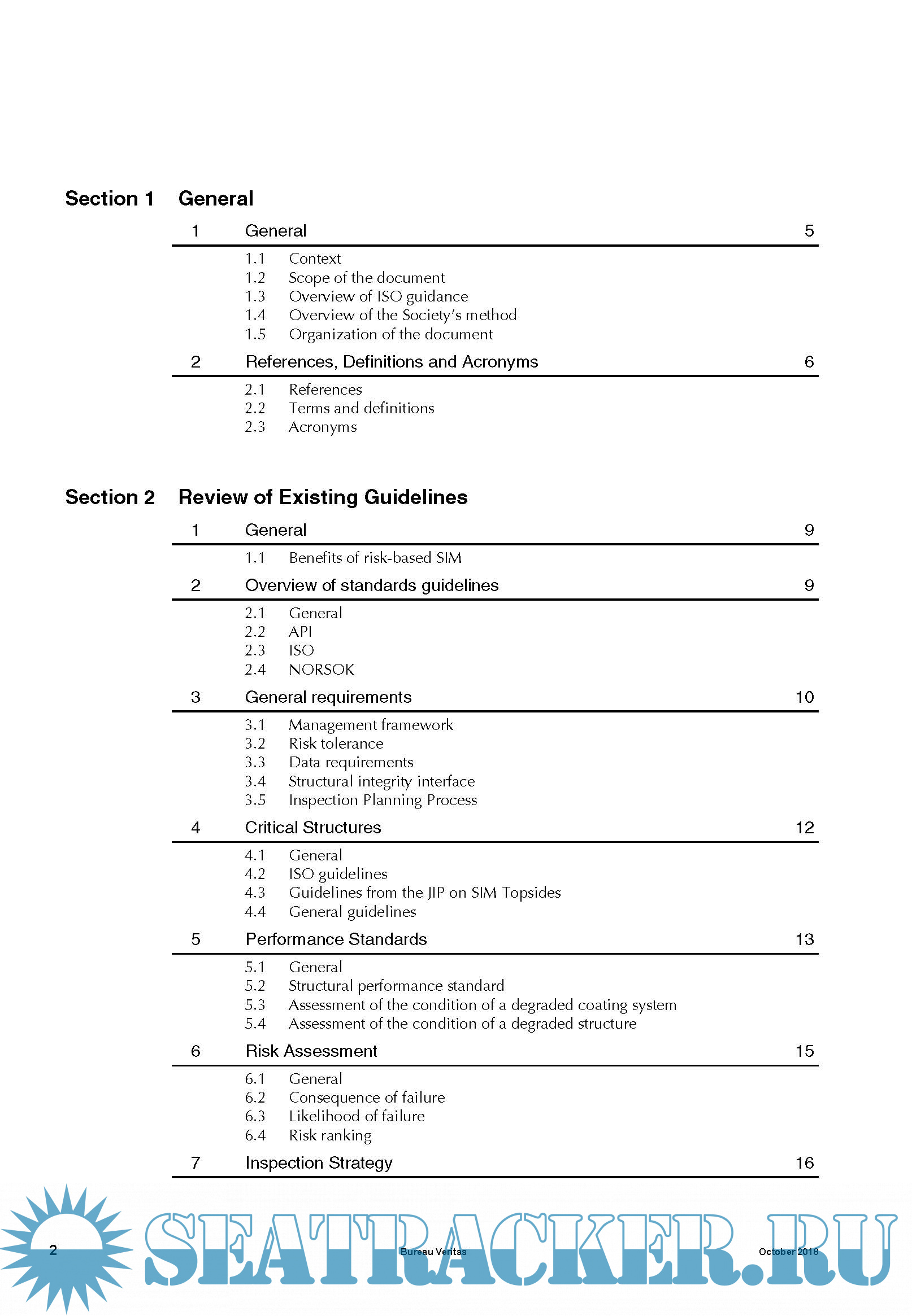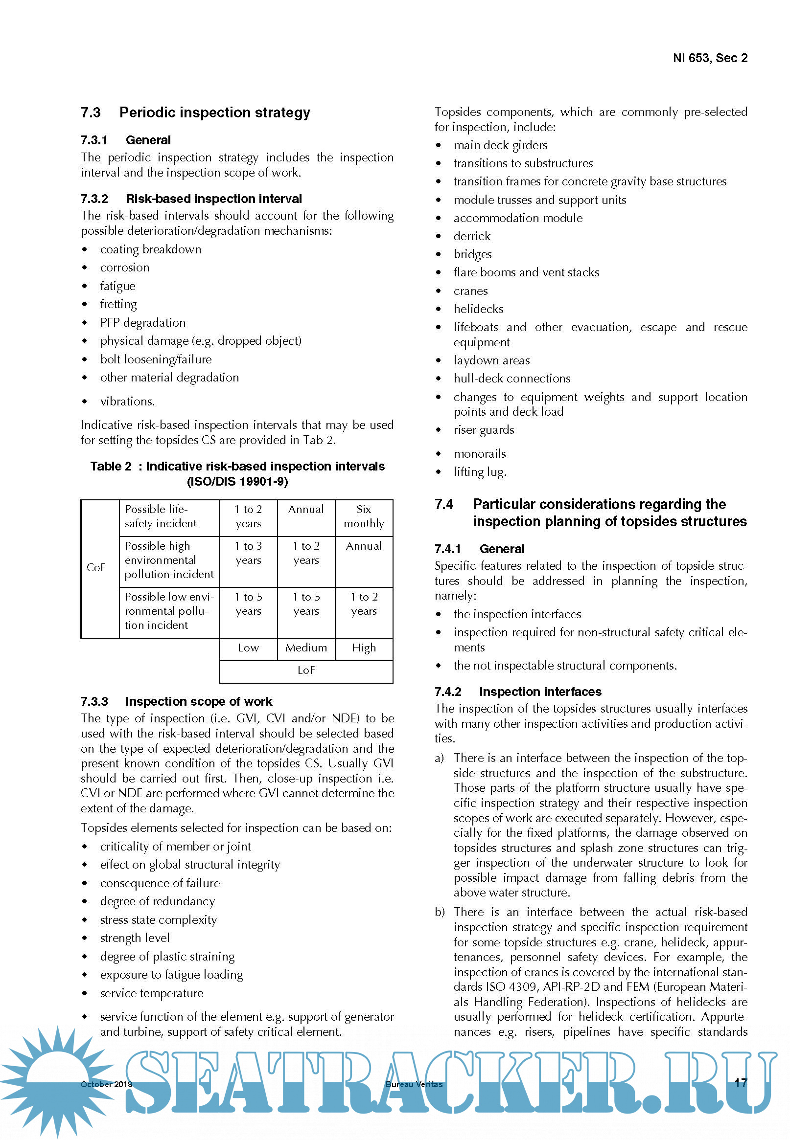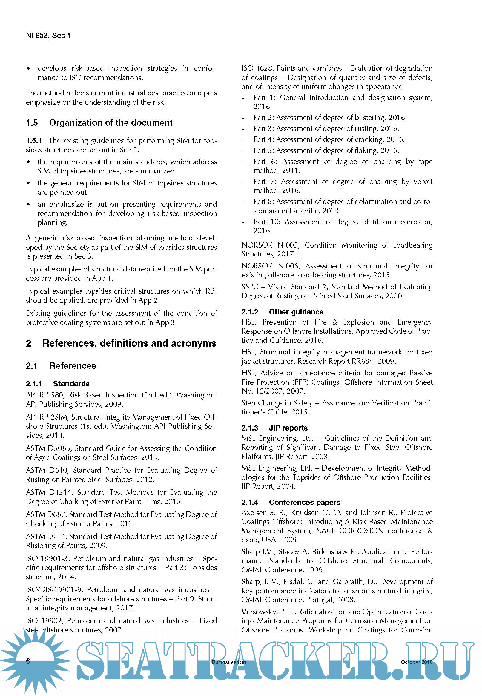 Year: 2018 Language: english Author: BV Genre: Guide ISBN: NI 653 DT R00 Format: PDF Quality: eBook Pages count: 35 Description: Current industrial practice for the inspection of topsides structures is based on API-RP-2SIM requirement that inspection of topsides structure be performed annually by visual examination. However, the final report of the Joint Industry Project (JIP) on the Structural Integrity Management (SIM) of topsides structures acknowledged that even if the annual visual inspection allows a high proportion of typical degradations to be detected, it may fail in detecting those that lead to a significant percentage of the reported failures (MSL, 2004). It proposed therefore a risk-based approach as an alternative to improve topsides inspection regimes. This leads to more frequent and detailed inspection of high-risk structures increasing the likelihood of detecting early enough critical defect. Following the release of the API-RP-2SIM which addresses the issue of Risk-Based Inspection (RBI) especially for the underwater structure of fixed offshore platforms, the development of guidance for the RBI of other offshore structures, especially topsides structures is being considered. In this vein, the International Organization for Standardization (ISO) has developed a specific standard for the SIM of offshore structures (ISO/DIS 19901-9) including topsides structures in which guidance for performing RBI is provided.
