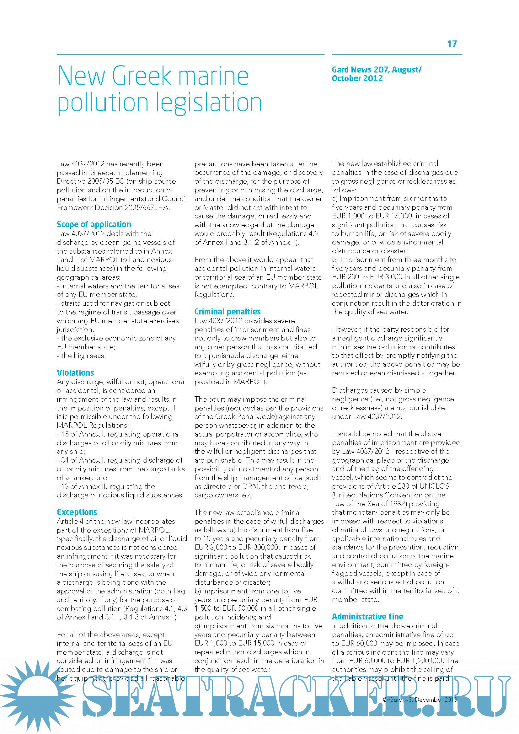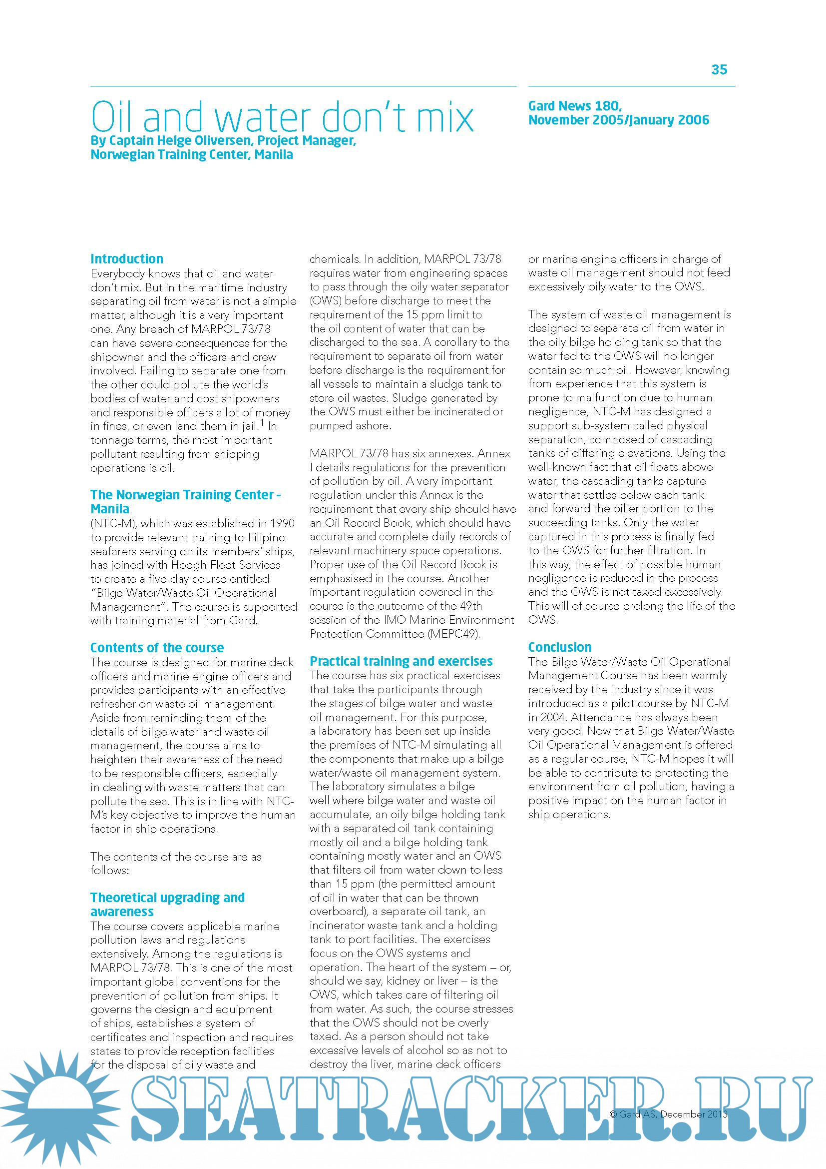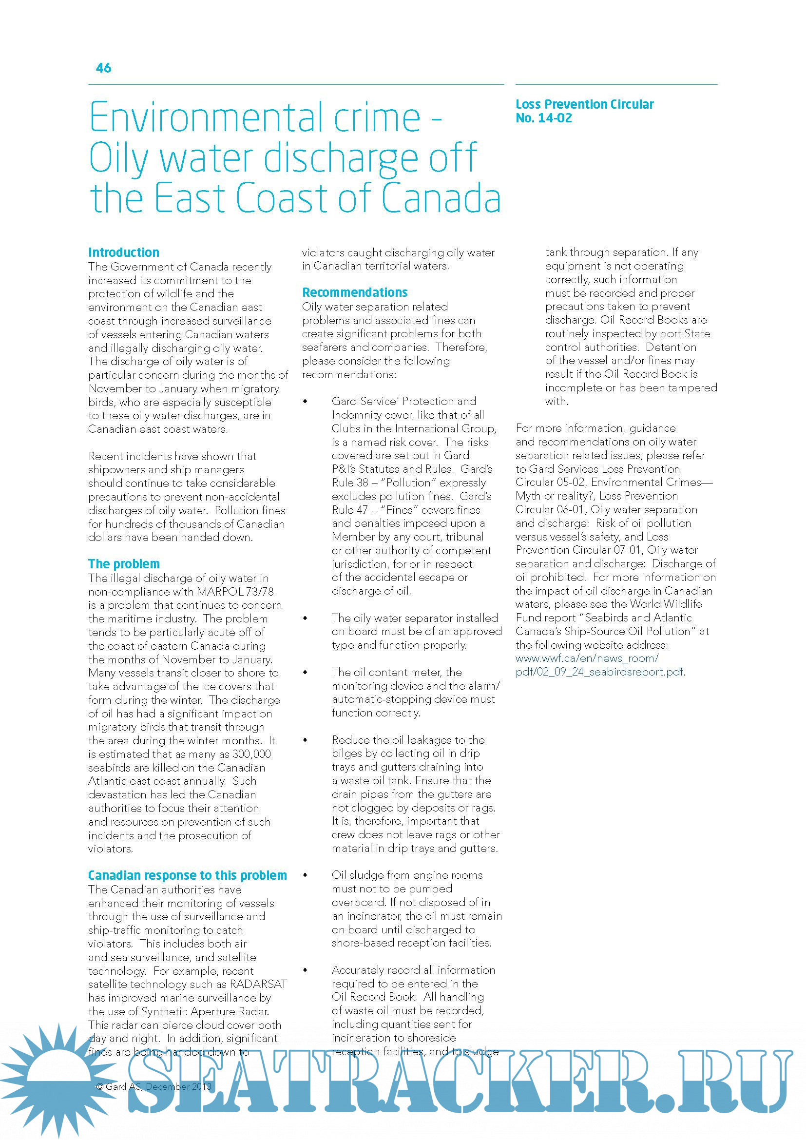 Year: 2013 Language: english Author: Gard P&I Genre: Handbook Format: PDF Quality: eBook Pages count: 50 Description: This booklet contains a collection of loss prevention material relating to the prevention of pollution by oil, which over the years has been published by Gard. Discharges of oil from shipping, offshore extraction of oil, and transport of oil in pipelines is the result of either accidents or “normal”, deliberate operational discharges. Accidental discharges (oil spills) may occur when vessels collide, are in some sort of distress at sea (engine breakdown, fire, explosion), run aground, or when there is a blowout of an offshore oil well, or when a pipeline breaks. Much can be done to avoid accidents, but there will always be unfortunate circumstances and situations that give rise to accidents. Operational