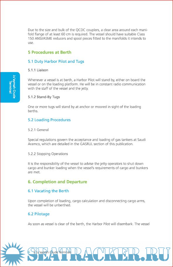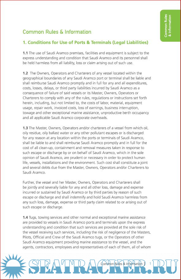 Description: This book is designed as a reference work for the purpose of acquainting Owners, Charterers, Masters of vessels and others with the general conditions, rules, regulations, facilities and available services at all Saudi Aramco Terminals. Every vessel which arrives at any Saudi Aramco Port or Terminal must have a copy of this book on board which is obtainable through the vessel’s agent. Every Master wishing to berth at any Saudi Aramco port or terminal must contract to comply with all the rules and regulations contained herein.