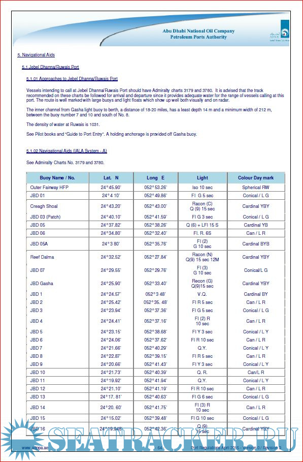 Year: 2015 Language: english Author: ADNOC Genre: Handbook Format: PDF Quality: eBook Pages count: 128 Description: These Regulations are issued in accordance with the Petroleum Ports Law No. 12 of 1973 and the amending Laws No. 1, 3, 34 and 45 issued at Abu Dhabi on 27th February 1980, 28th April 1981, 5th May 1985, and 4th November 2003 respectively. These Regulations shall apply to the Petroleum Ports of Jebel Dhanna, Ruwais, Das, Sas Al-Nakhl and any other Petroleum Port that comes under the Petroleum Ports Authority.