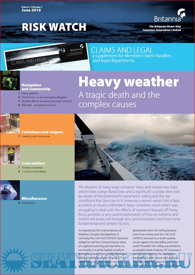 Description: We seek to raise awareness of issues, which often come to our notice through the experience of Members themselves. Our quarterly publication Risk Watch, together with its Claims and Legal supplement, is the main vehicle for spreading technical information to our Members and those serving on board ships entered in the Club.