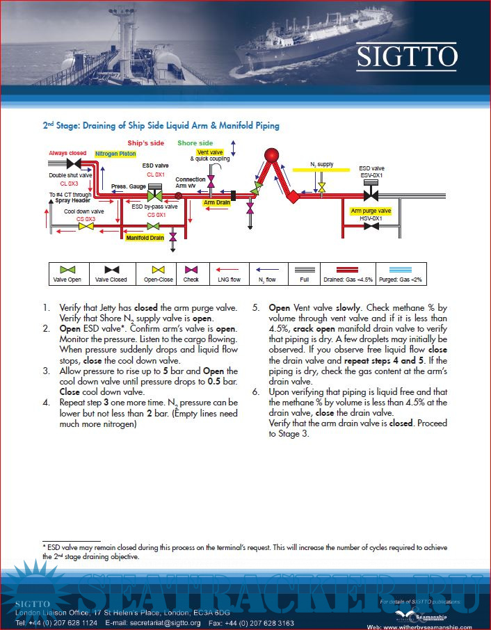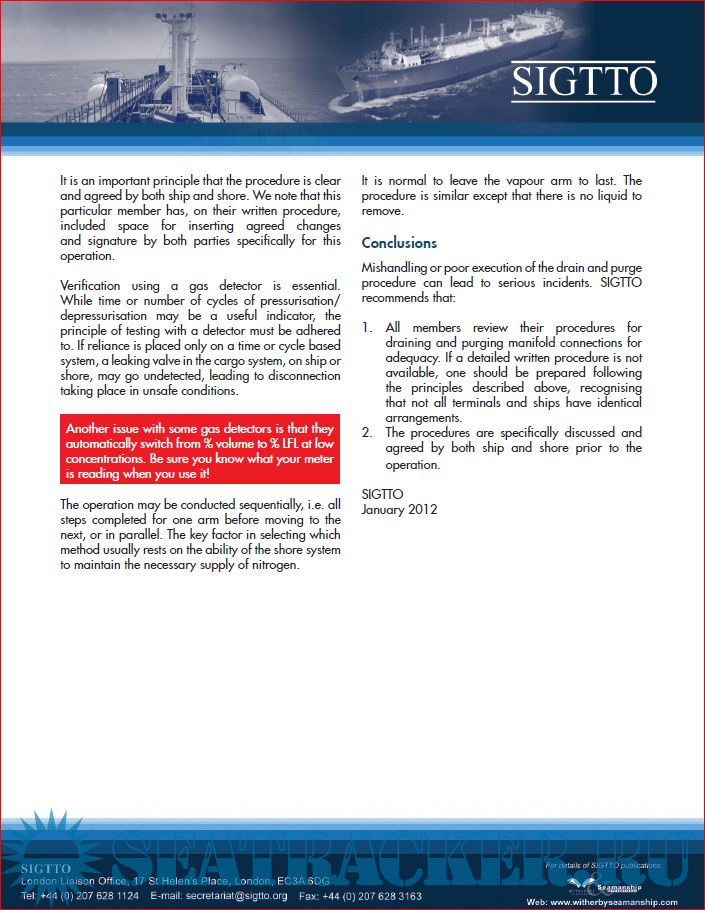 Description: SIGTTO has published an advice on LNG transfer arms and manifold draining, purging and disconnection procedure which has been prepared following reports from a number of their members that there appears to be confusion and misunderstanding among some ship and jetty operators over the safe conduct of disconnection procedures following loading and discharge.