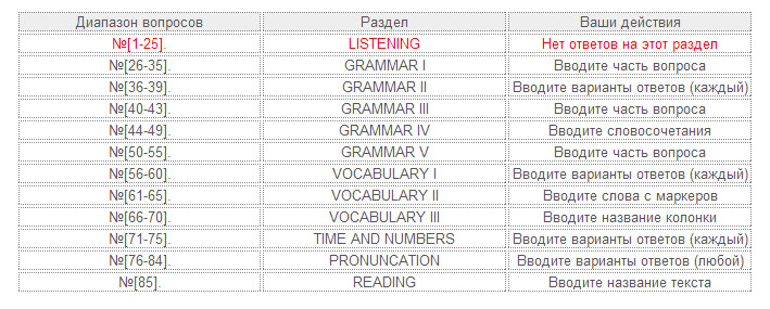 В зависимости от раздела вводим либо часть вопроса, либо варианты ответов.