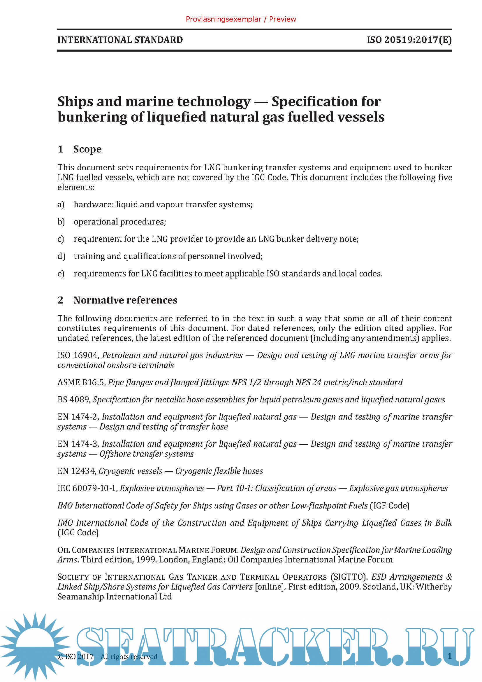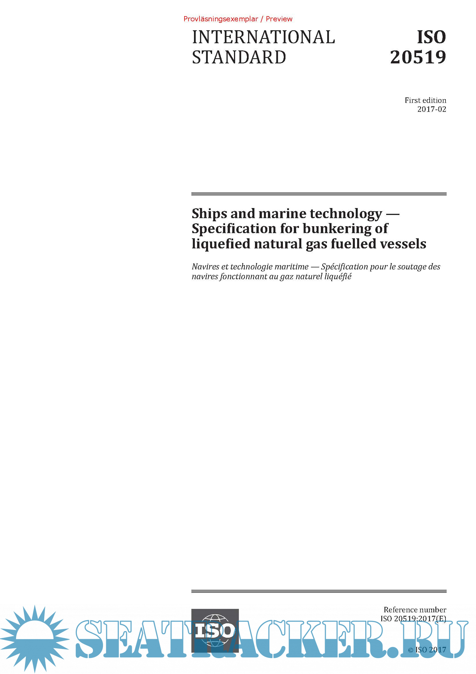 Ships and marine technology, Specification for bunkering of liquefied natural gas fuelled vessels, First edition (ISO 20519)