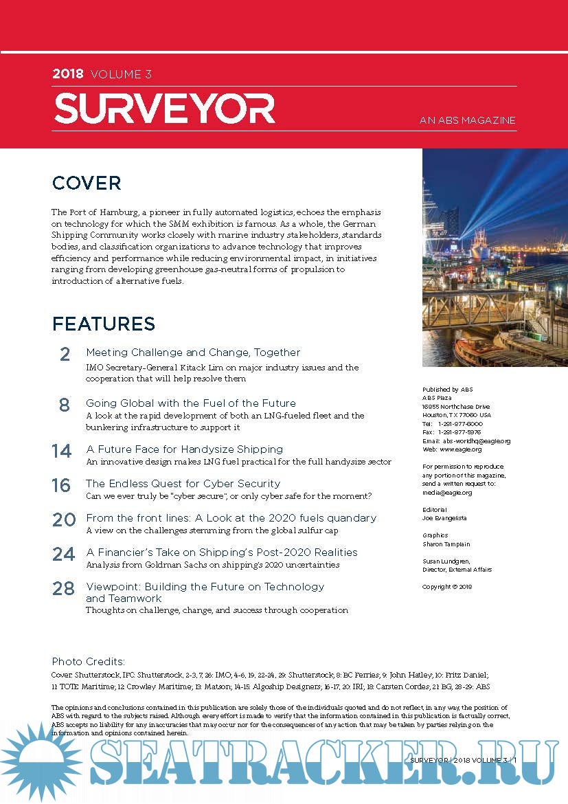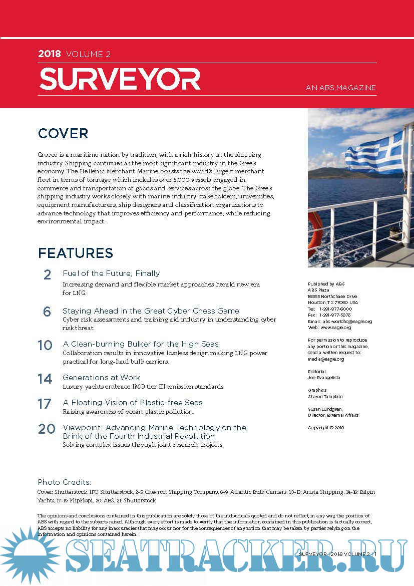 Year: 2018 Language: english Author: ABS Genre: Periodical (magazine) Format: PDF Quality: eBook Pages count: 108 Description: Digital Future Now: The future takes shape today. The cover image, created by PSA international to illustrate the digital transformation of the Port of Singapore, hints at the high level of connected technologies now employed to bring new levels of safety and productivity to leading ports and terminals around the world. Through use of new digital technologies, businesses across the maritime industry are discovering new ways to boost efficiency, new methods of solving problems, new operational philosophies, and even new ways to cultivate staff talents. This issue of Surveyor looks at some of the ways digital transformation is being realized around the industry. Posidonia Special Issue: Greece is a maritime nation by tradition, with a rich history in the shipping industry. Shipping continues as the most significant industry in the Greek economy. The Hellenic Merchant Marine boasts the world’s largest merchant fleet in terms of tonnage which includes over 5,000 vessels engaged in commerce and transportation of goods and services across the globe. The Greek shipping industry works closely with marine industry stakeholders, universities, equipment manufacturers, ship designers and classification organizations to advance technology that improves efficiency and performance, while reducing environmental impact. SMM Special Issue: The Port of Hamburg, a pioneer in fully automated logistics, echoes the emphasis on technology for which the SMM exhibition is famous. As a whole, the German Shipping Community works closely with marine industry stakeholders, standards bodies, and classification organizations to advance technology that improves efficiency and performance while reducing environmental impact, in initiatives ranging from developing greenhouse gas-neutral forms of propulsion to introduction of alternative fuels. Gastech Special Issue: The Port of Barcelona has been a hub of international trade since it was founded as the Roman colony of Barcino some 2,000 years ago, when its chief business was export of building stones and highly-prized Spanish wines. Today, Barcelona is equally famed as an intermodal center and host of international trade shows such as Gastech 2018, a premier conference focusing on the gas industry and maritime companies involved in gas transport, where over 30,000 professionals meet to share insight on the latest innovations in the fast-moving world of natural gas and LNG.