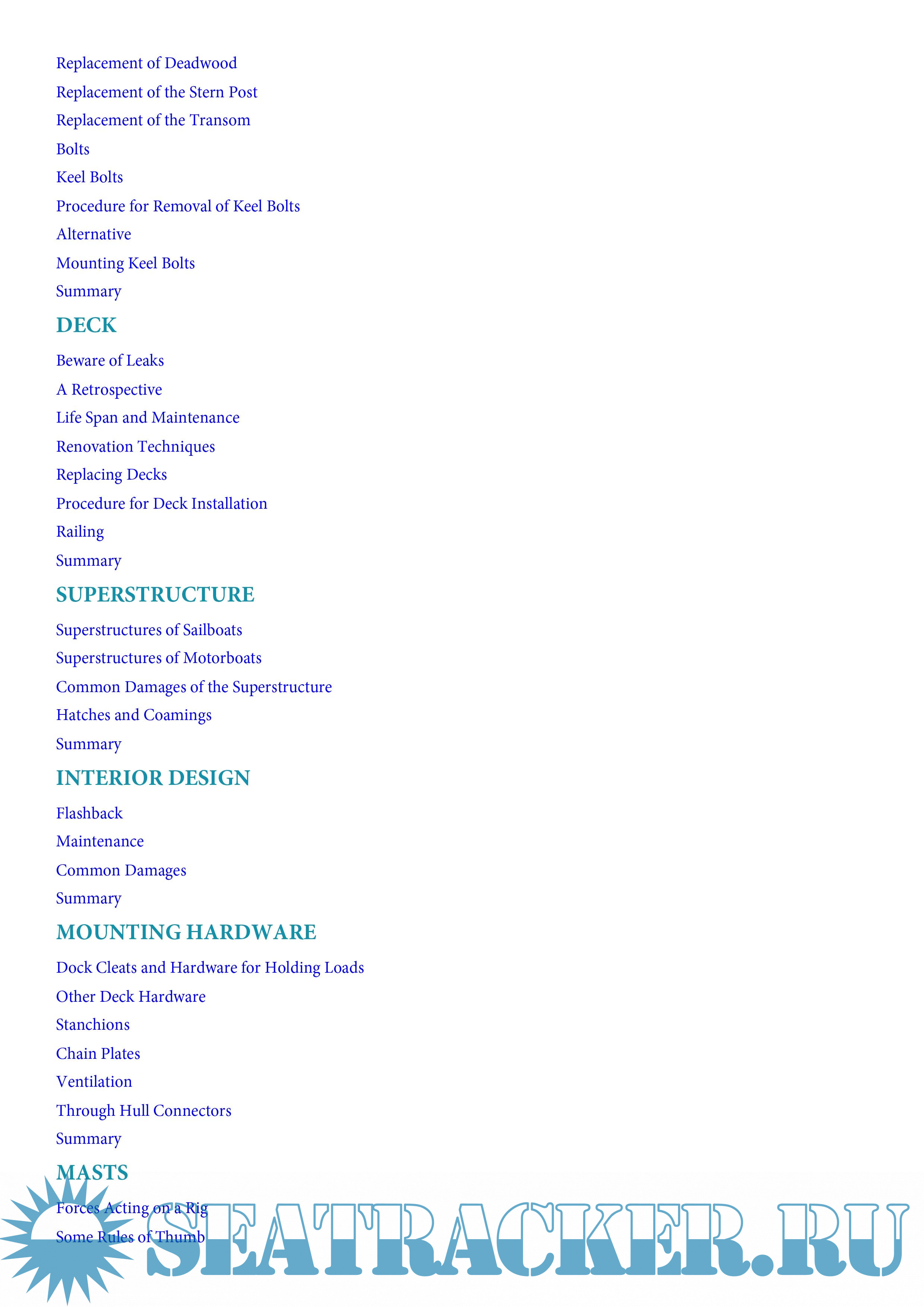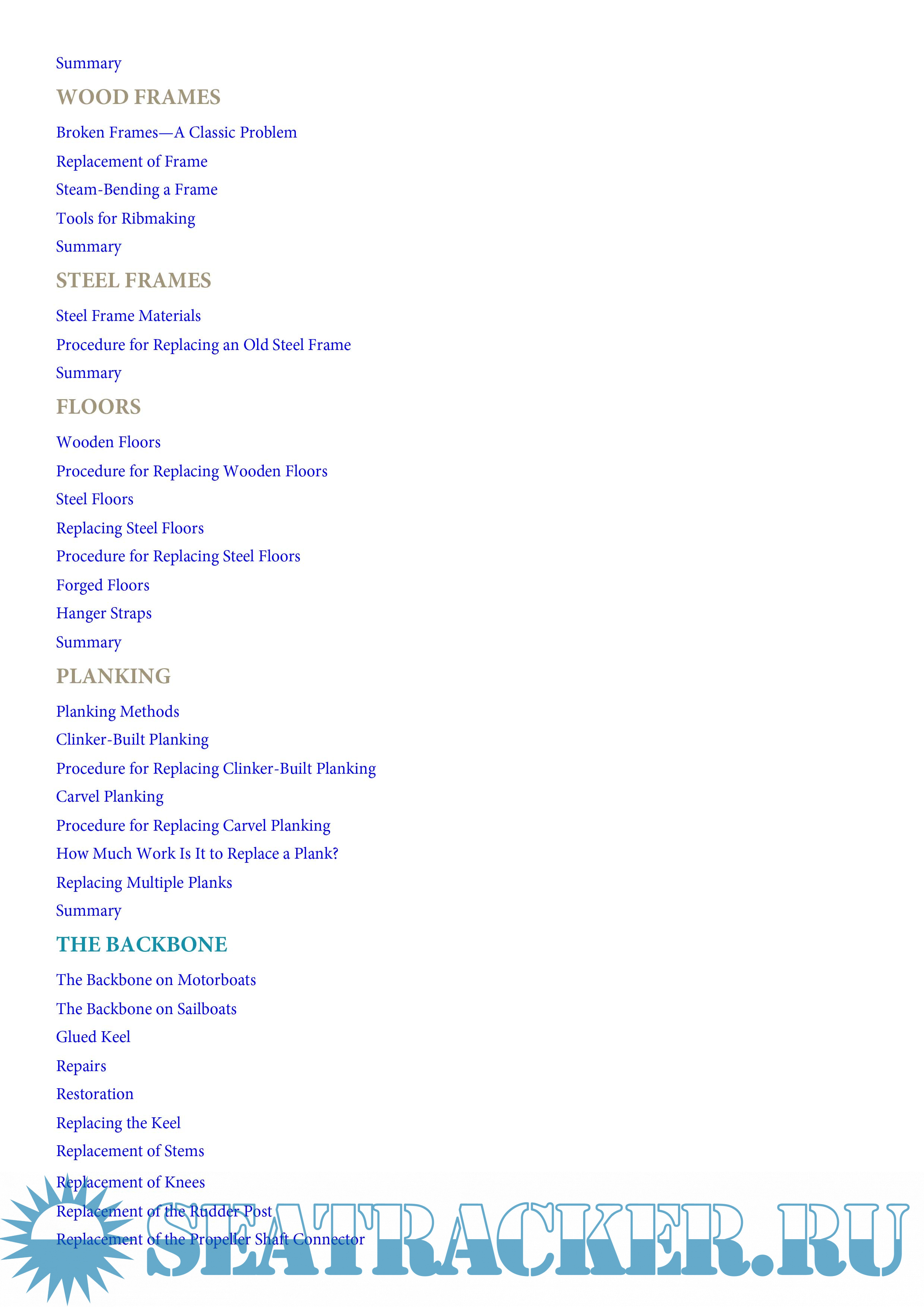 This book contains chapters on boat care, including winter maintenance, racing, finishing, and stripping. You will also find current information on boat building, gluing, and tools. The most extensive part of this book consists of chapters that describe the detailed clean repair of wooden boats”everything from plug-accession and bonding to changing socks and bottom engine installation.