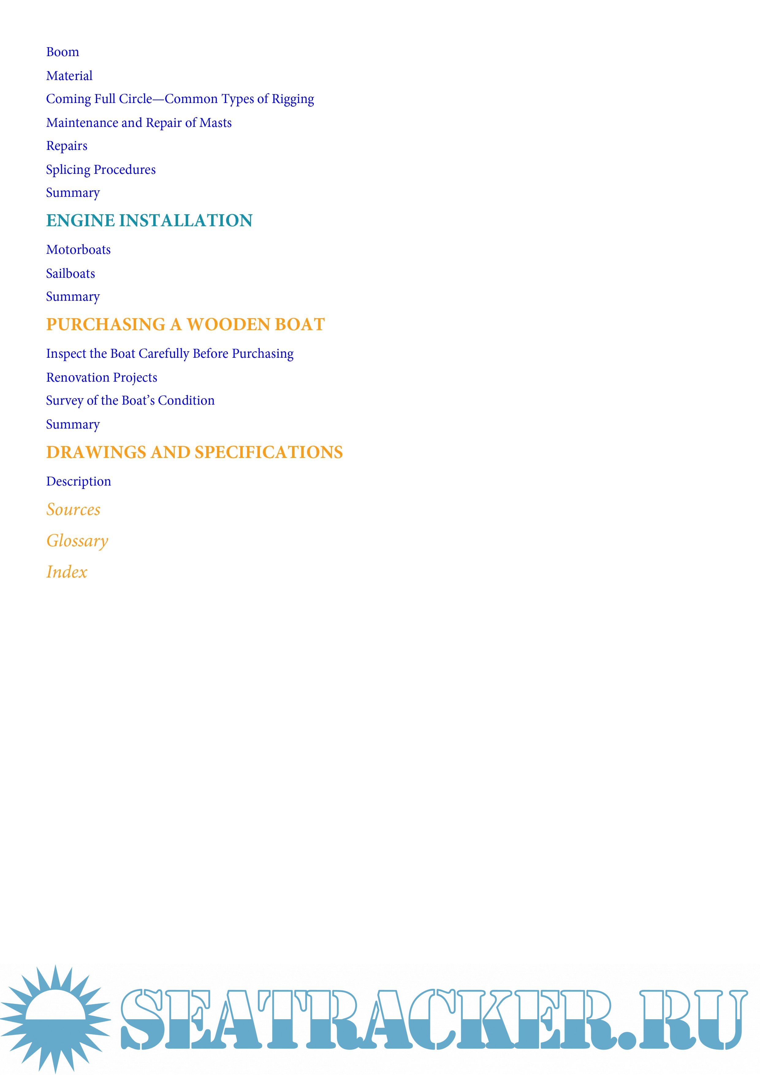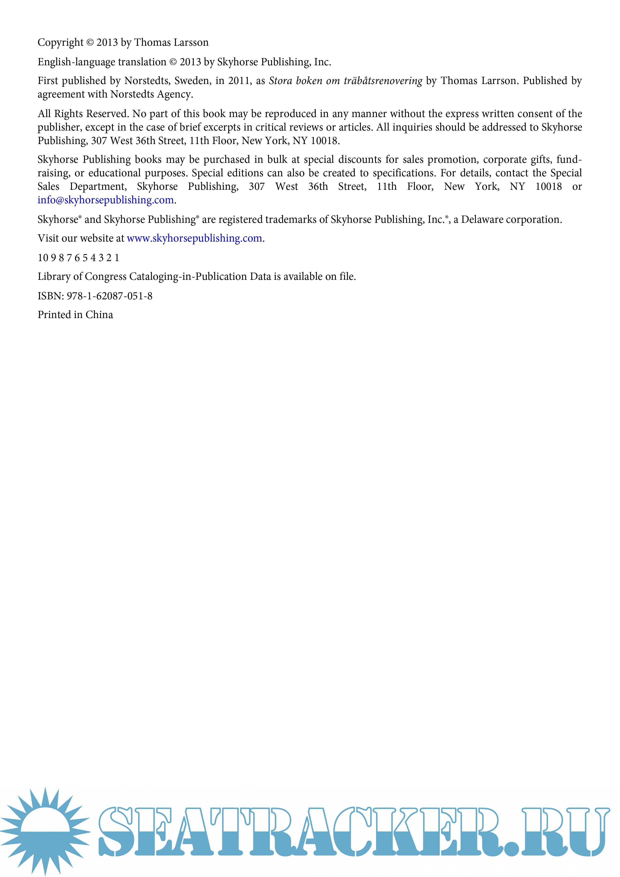 Year: 2013 Language: english Author: Thomas Larsson Genre: Reference book Publisher: Skyhorse Publishing, Inc. ISBN: 978-1-62087-051-8 Format: PDF Quality: eBook Pages count: 315 Description: The Big Book of Wooden Boat Restoration is the perfect introduction or reference guide for wooden boat lovers both experienced and new. Author Thomas Larsson, one of Sweden's most experienced and premier wooden boat restorers, has gathered his thorough knowledge of the subject for the reader and placed it in this book with informative facts and an extensive glossary, accessible to new hobbyists and longtime boat lovers alike. This book contains chapters on boat care, including winter maintenance, racing, finishing, and stripping. You will also find current information on boat building, gluing, and tools. The most extensive part of this book consists of chapters that describe the detailed clean repair of wooden boats”everything from plug-accession and bonding to changing socks and bottom engine installation. Larsson includes a history of boat building and provides a nice glimpse of different wooden boats with over 200 sketches and photos in both color and black-and-white. He explains how staying on top of maintenance keeps a unique fleet of wooden boats alive. With practical instructions and fact-boxes with advice and tips, this book will teach you all about maintenance: surface treatment, scraping the hull, equipping the boat in the spring, and looking after it in the winter, as well as tips about buying a boat, installing an engine, and more.