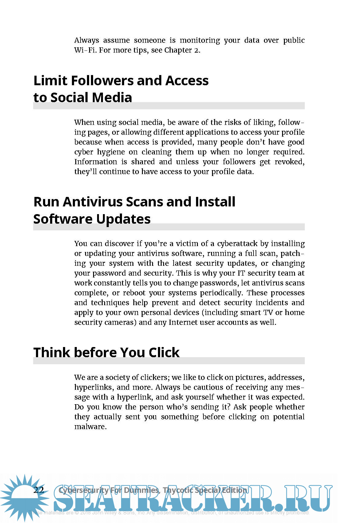 Year: 2018 Language: english Author: Thycotic Genre: Guide ISBN: 978-1-119-46739-7 Format: PDF Quality: eBook Pages count: 29 Description: Cybersecurity For Dummies, Thycotic Special Edition, helps you understand and recognize the most common cybersecurity threats people face daily in their personal and work lives. With that understanding, you can then begin to adopt good cyber hygiene that helps you avoid becoming the next victim. Spending a few minutes reading this book also helps you learn how cybercriminals target their victims, what you can do to reduce your risk, and how you can personally make it much more difficult for the attackers to steal your information, your identity, and your money.