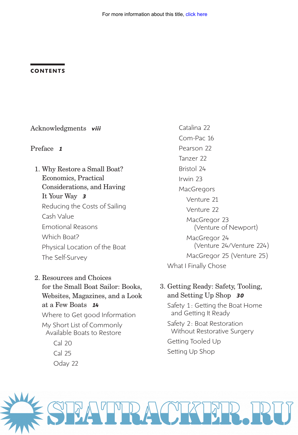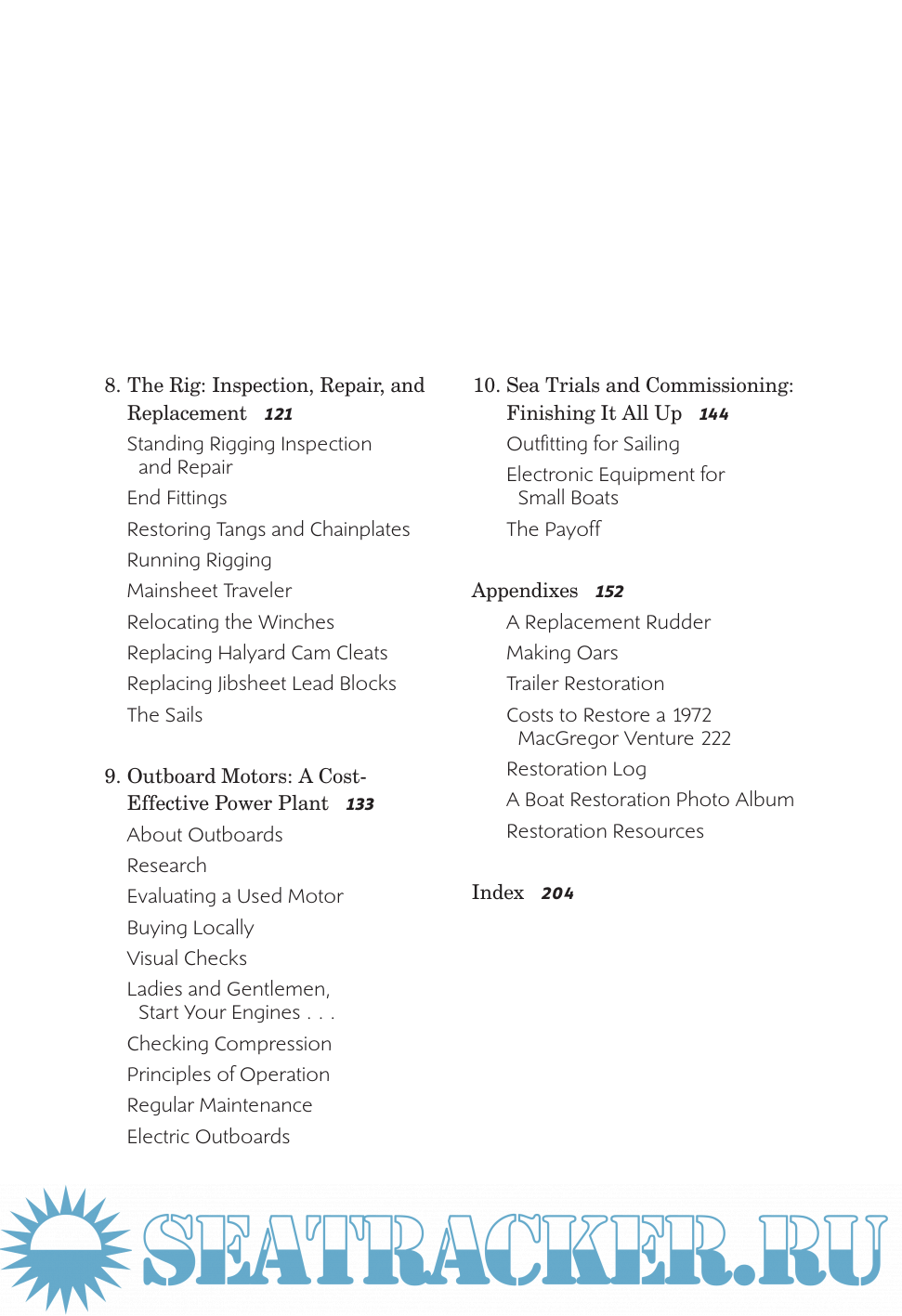 Gilbert's clear, step-by-step instructions guide you through every phase of the restoration process from repairing keels, hulls, ports, and cabins to painting, wiring, and sealing. You'll learn how to evaluate, repair and replace hardware, upholstery, canvaswork, and more. Profusely illustrated appendices give you a vivid picture of the costs, tasks, and labor involved in an actual restoration project.