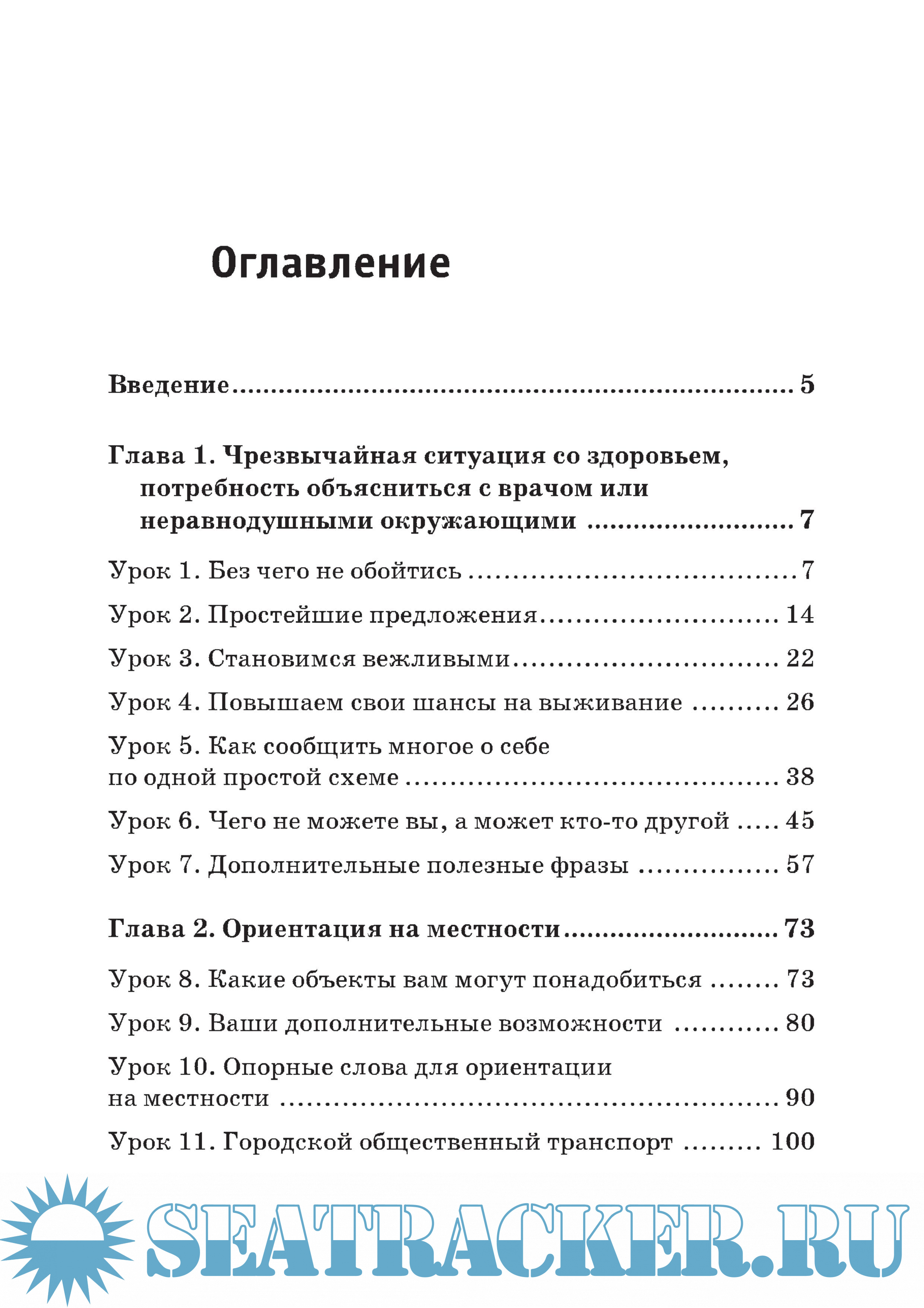 Введение 5 Глава 1. Чрезвычайная ситуация со здоровьем, потребность объясниться с врачом или неравнодушными окружающими 7 Урок 1. Без чего не обойтись 7 Урок 2. Простейшие предложения 14 Урок 3. Становимся вежливыми 22 Урок 4. Повышаем свои шансы на выживание 26 Урок 5. Как сообщить многое о себе по одной простой схеме 38 Урок 6. Чего не можете вы, а может кто-то другой 45 Урок 7. Дополнительные полезные фразы 57 Глава 2. Ориентация на местности... 73 Урок 8. Какие объекты вам могут понадобиться 73 Урок 9. Ваши дополнительные возможности 80 Урок 10. Опорные слова для ориентации на местности 90 Урок 11. Городской общественный транспорт 100 Глава 3. Покупка чего-либо 116 Урок 12. Самое необходимое 116 Урок 13. Формулировка желания купить и покупка продуктов 126 Урок 14. Покупка промышленных товаров 145 Урок 15. Заказ в кафе или ресторане 161 Урок 16. Покупка билетов на транспорт и выезд в другой населенный пункт 170 Урок 17. Обмен валюты 180 Глава 4. Вы что-то или кого-то потеряли 189 Глава 5. Вы подверглись воздействию злоумышленников: у вас что-то украли или на вас напали 198 Глава 6. Гостиница.. 211 Глава 7. Таможня.... 225 Глава 8. Если власти имеют к вам претензии 229 Итоговая шпаргалка ко всей книге: самое необходимое 234