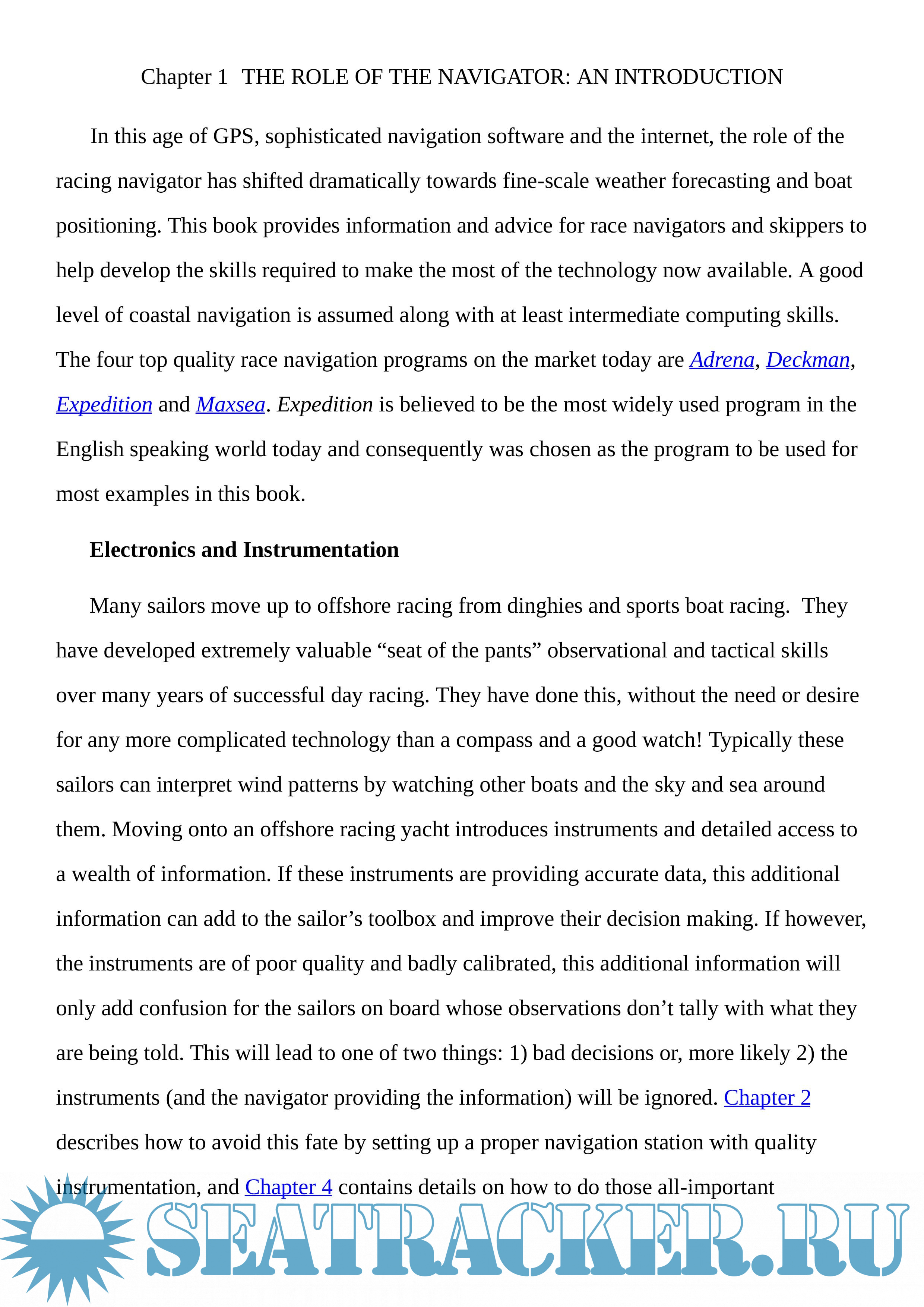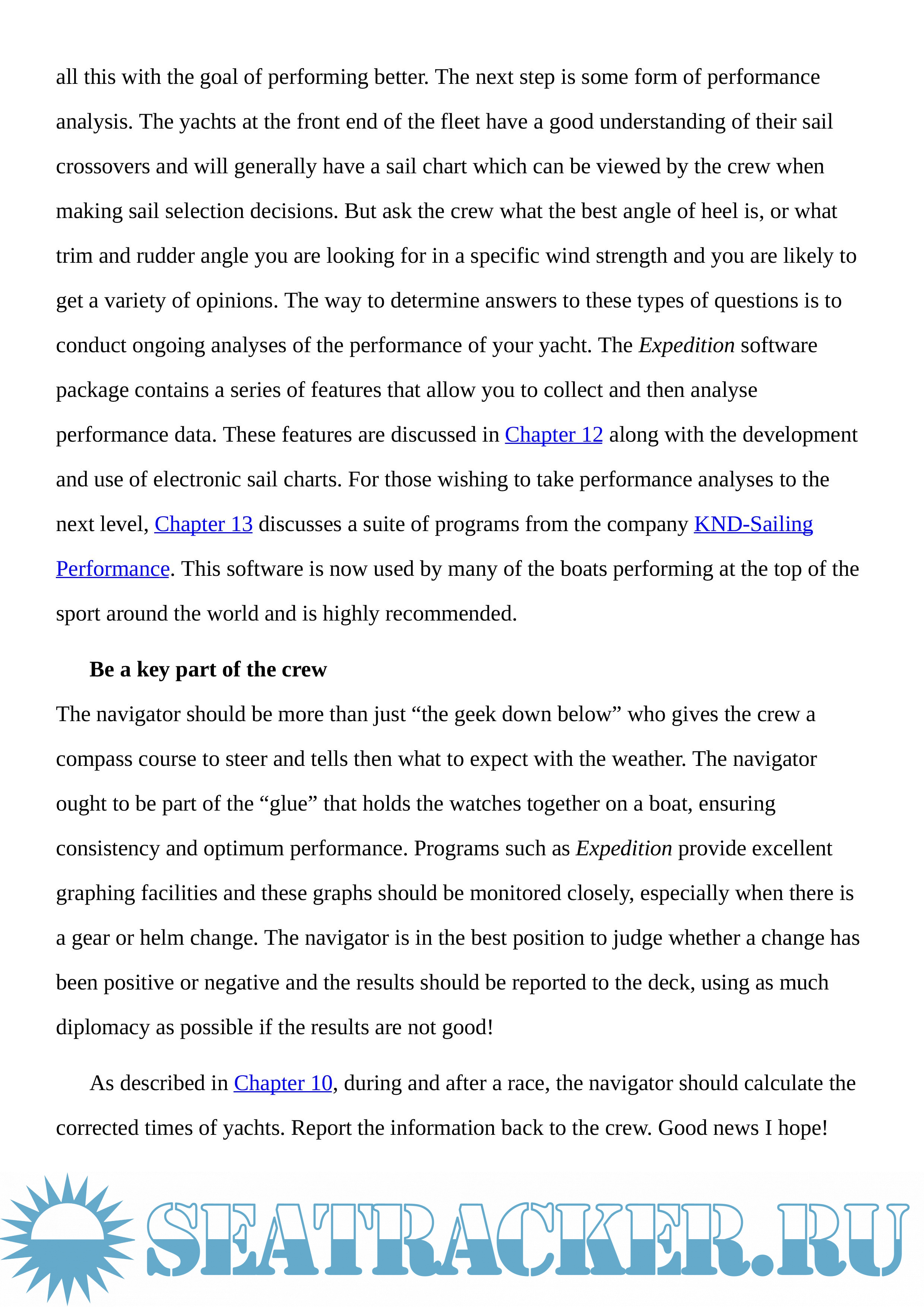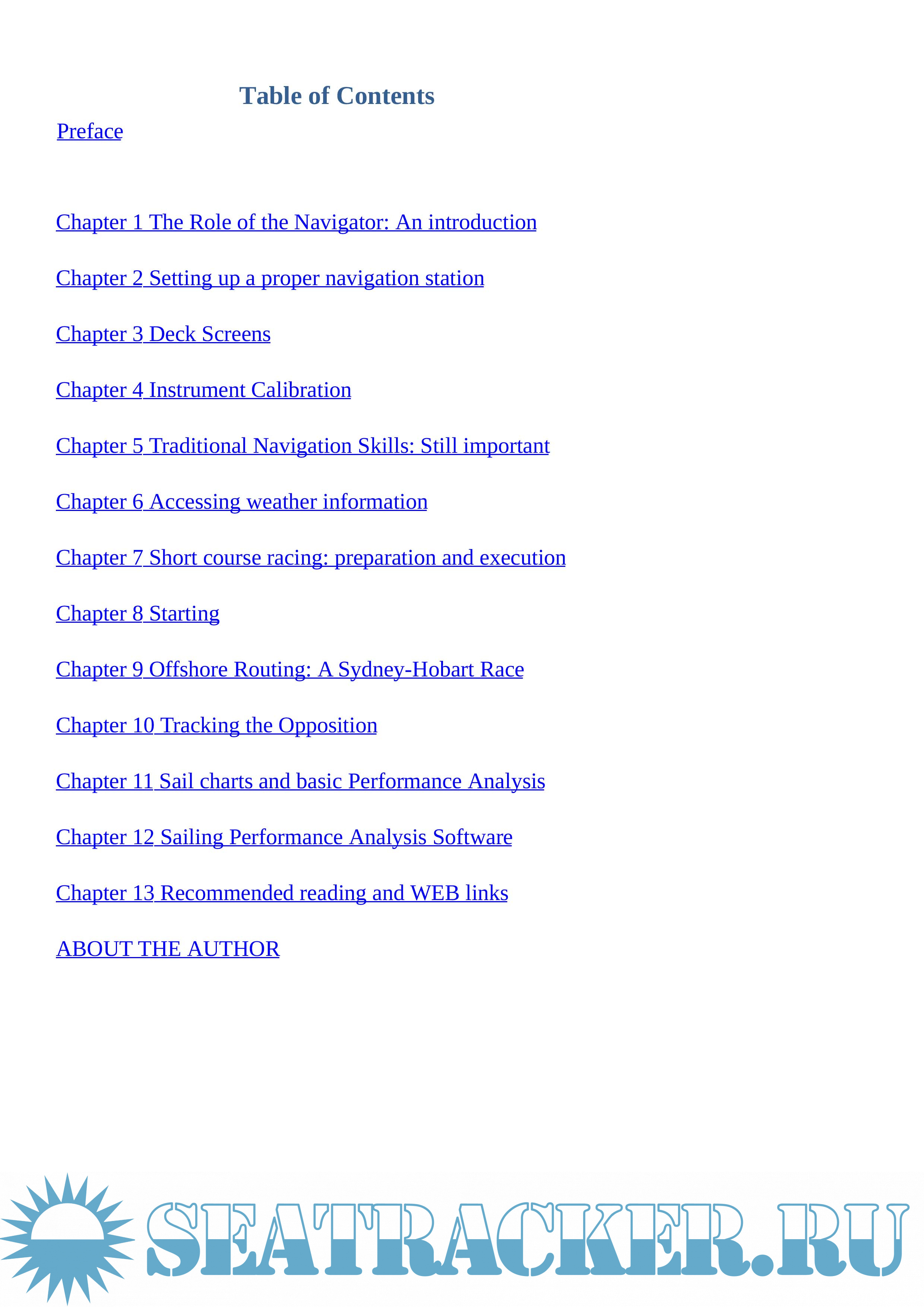Information is provided on setting up a navigation station, deck screens, instrument calibration, accessing weather information, short course racing, starting, offshore routing, tracking the opposition, sail charts, and performance analysis. Web links are provided throughout the book to allow the reader to visit the relevant web sites as they read through the book. Recommended reading and key web sites are provided at the end of the book.