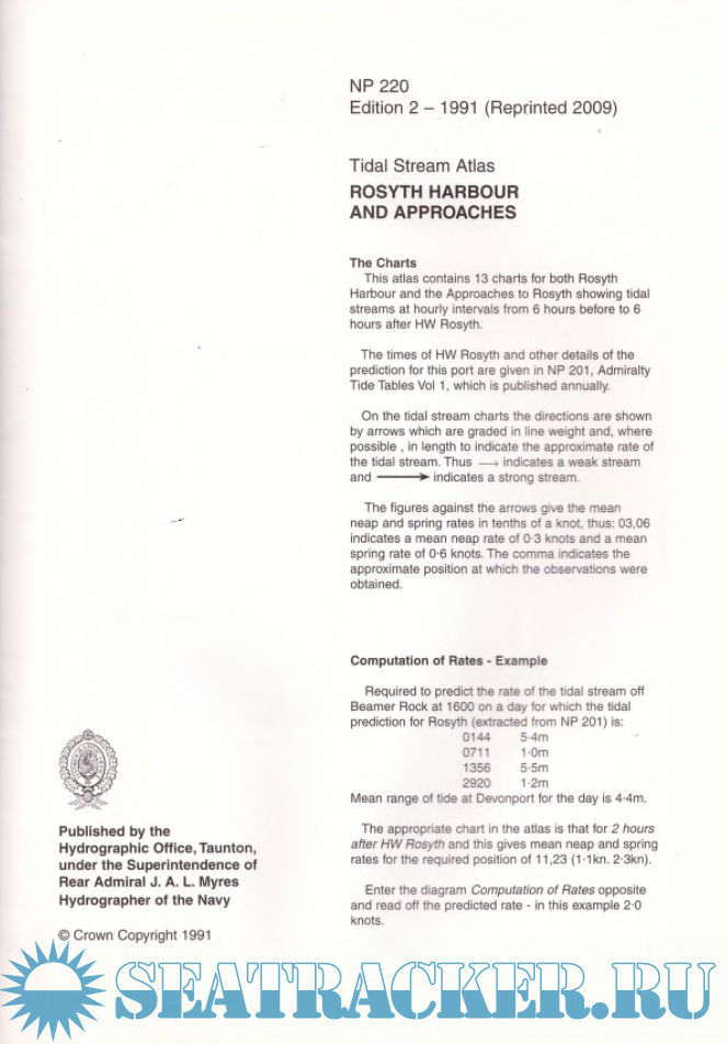 Year: 2009 Language: english Author: UK Hydrographic Office Genre: Reference book Publisher: UK Hydrographic Office Edition: 2nd (1991) ISBN: 978-0-70-771-2208 Format: PDF Quality: Scanned pages Pages count: 30 Description: This tidal stream atlas from Admiralty contains 13 charts showing tidal streams for both Rosyth Harbour and the Approaches to Rosyth at hourly intervals from 6 hours before to 6 Hours after HW Rosyth. The atlas also includes a diagram which will assist you in calculating the tidal stream rates for your required day.