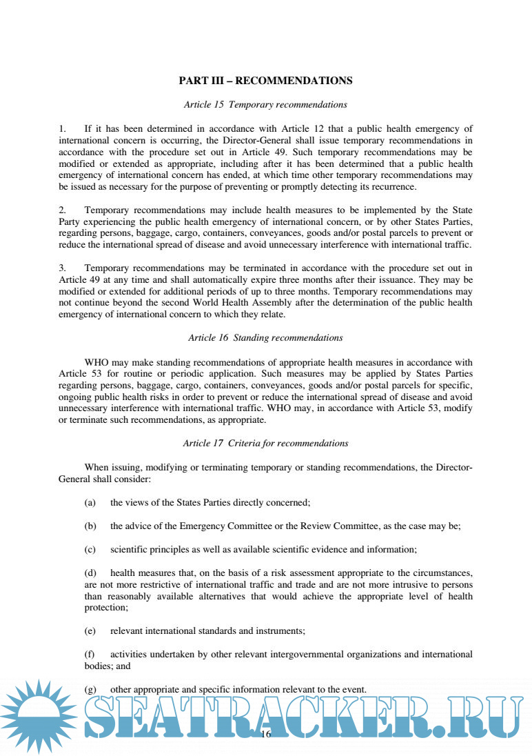 By not limiting the application of the IHR (2005) to specific diseases, it is intended that the Regulations will maintain their relevance and applicability for many years to come even in the face ofthe continued evolution of diseases and of the factors determining their emergence and transmission. The provisions in the IHR (2005) also update and revise many of the technical and other regulatory functions, including certificates applicable to international travel and transport, and requirements forinternational ports, airports and ground crossings.