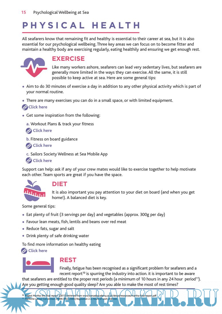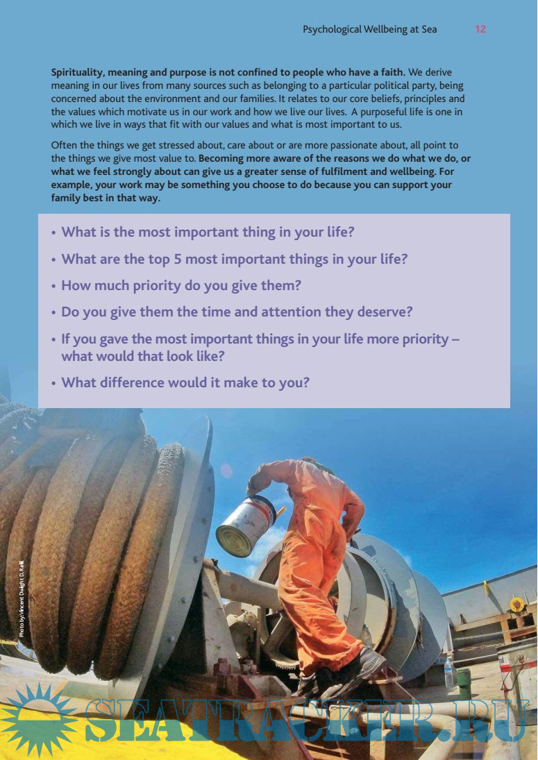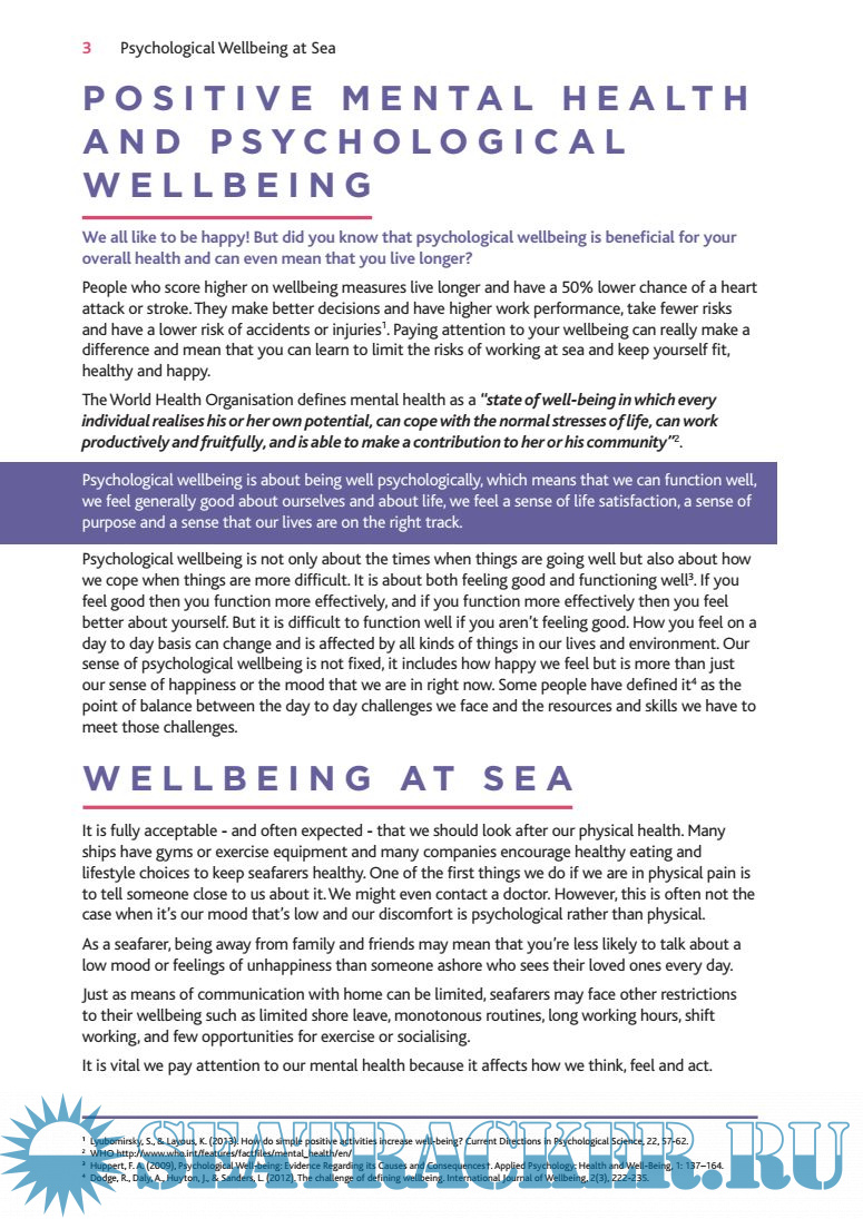 It aims to explain what positive mental health and psychological wellbeing are, and help you to recognise the risks to wellbeing that you may face as aseafarer. In this guide we have drawn together some of the best evidence available to give you some practical ideas about how to maximise your psychological wellbeing.