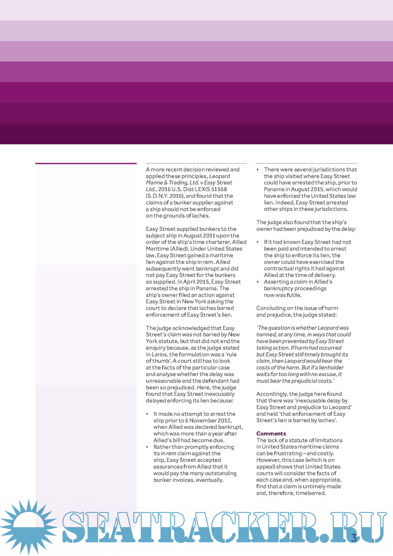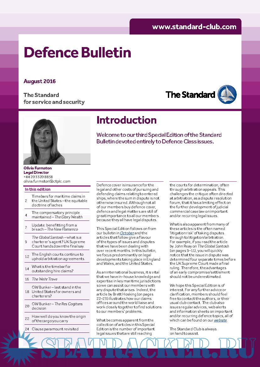 Year: 2016 Language: english Author: The Standard P&I Club Format: PDF Quality: eBook Pages count: 28 Description: This the Third Special Edition of the Standard Bulletin issued on August 2016 and devoted entirely to Defence Class issues. Defence cover is insurance for the legal and other costs of pursuing and defending claims relating to entered ships, where the sum in dispute is not otherwise insured. Although not all of our members buy defence cover, defence and legal matters are still of great importance to all our members because they all have legal disputes.