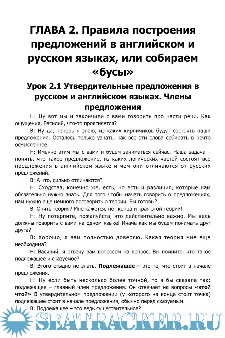 Год выпуска: 2015 Язык: Русский, Английский Автор: Наталия Городнюк Жанр: Учебное пособие Формат: PDF + fb2 Качество: Изначально компьютерное (eBook) Количество страниц: 139(pdf) + 213(fb2) Описание: Эта книга для тех, кто не любит читать скучные научные книги. Здесь вы найдете уникальный подход к грамматике английского языка, изложенной в форме диалога между преподавателем и учеником. Автор убежден, что английская грамматика очень проста, нужно только правильно донести ее до ученика. Книга состоит из теоретической и практической части. Сначала вы узнаете, как строятся разговорные предложения в английском языке, а после будете строить их самостоятельно. Доп. информация: Книга написана в форме живого диалога между Городнюк Наталией и Васей Пупкиным, который является отражением различных студентов автора. Как и большинству людей, ему присущи непонимание, желание задавать различные вопросы и делать поспешные выводы! Но к концу книги как в Васиной, так и в головах читателей, все разложится по полочкам.