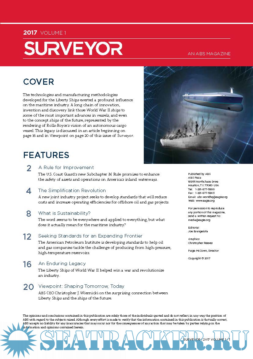 Year: 2017 Language: english Author: ABS Genre: Periodical (magazine) Format: PDF Quality: eBook Pages count: 24 Description: The technologies and manufacturing methodologies developed for the Liberty Ships exerted a profound influence on the maritime industry. A long chain of innovation, invention and discovery link those World War II ships to some of the most important advances in vessels, and even to the concept ships of the future, represented by the rendering of Rolls-Royce’s vision of an autonomous cargo vessel. This legacy is discussed in an article beginning on page 16 and in Viewpoint on page 20 of this issue of Surveyor.