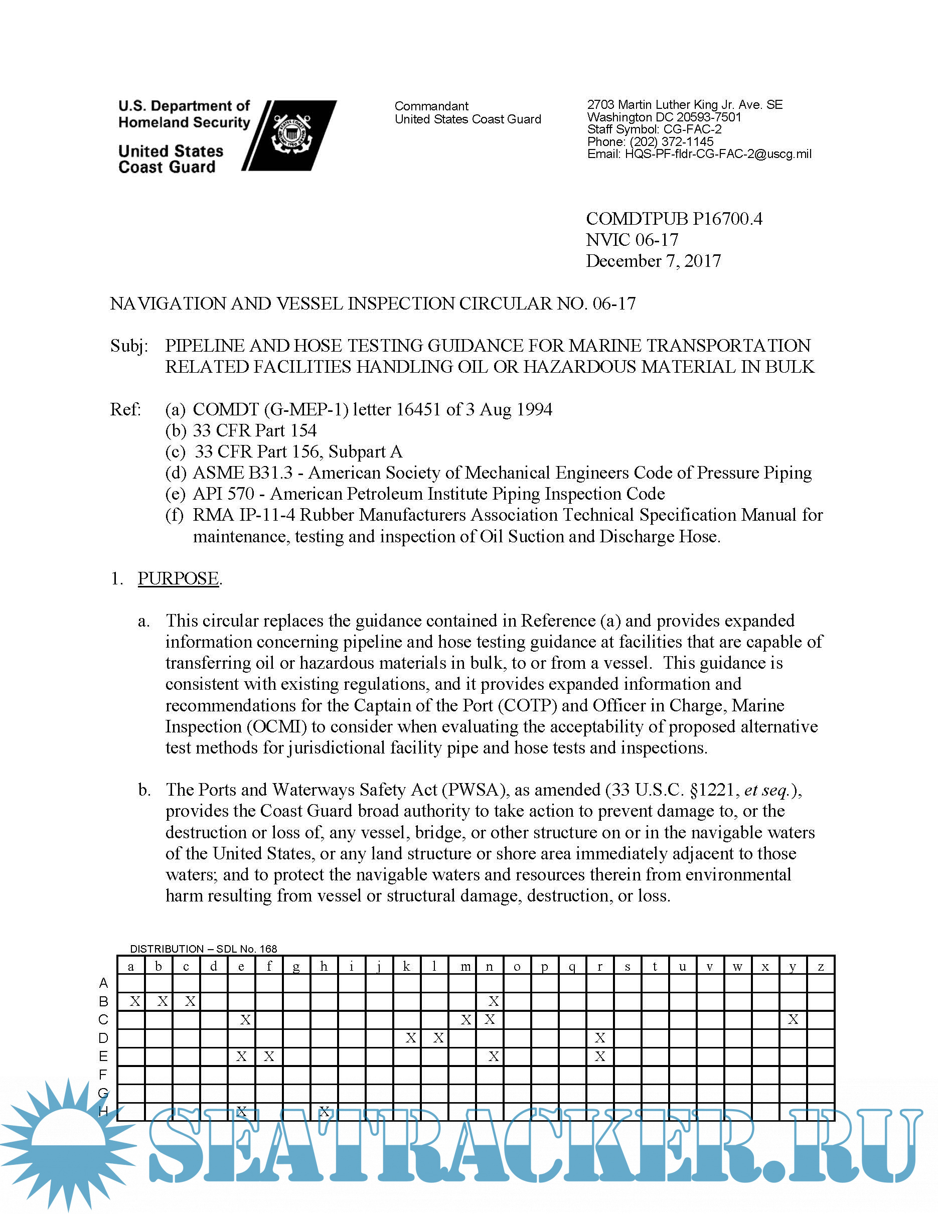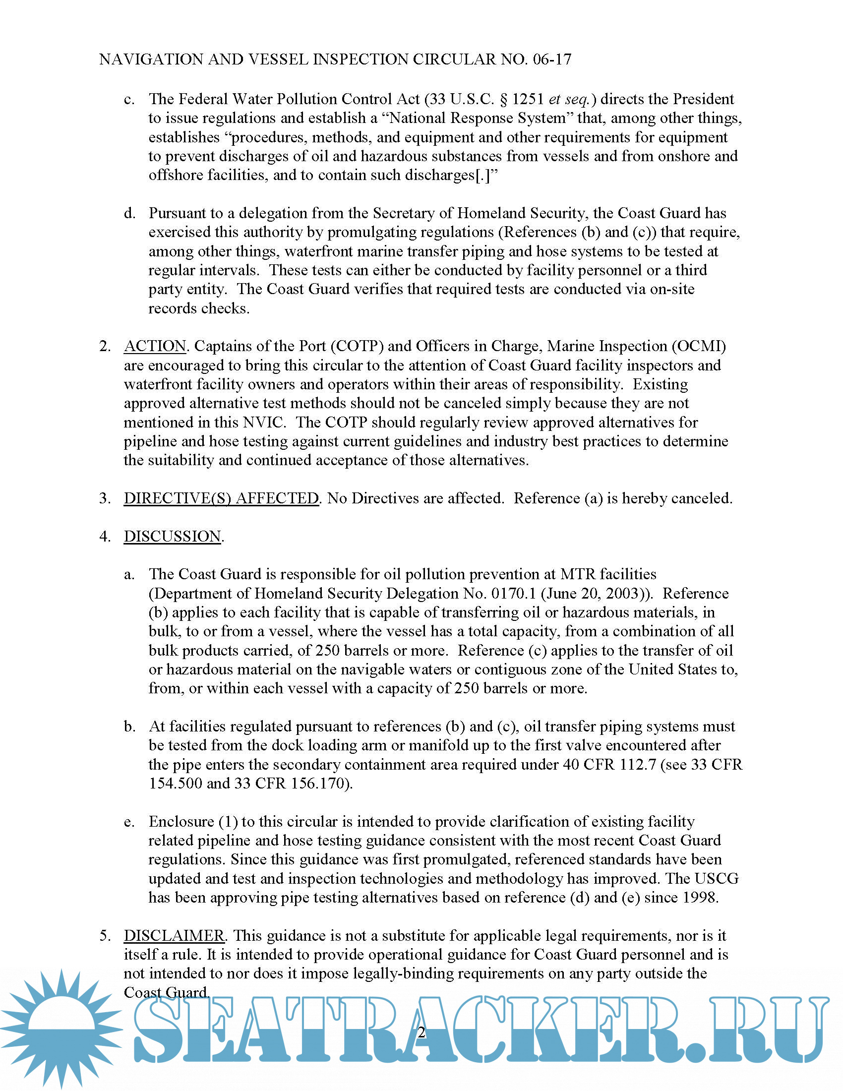Year: 2017 Language: english Author: USCG Genre: Guide Format: PDF Quality: eBook Pages count: 20 Description: This circular replaces the guidance contained in Reference (a) and provides expanded information concerning pipeline and hose testing guidance at facilities that are capable of transferring oil or hazardous materials in bulk, to or from a vessel. This guidance is consistent with existing regulations, and it provides expanded information and recommendations for the Captain of the Port (COTP) and Officer in Charge, Marine Inspection (OCMI) to consider when evaluating the acceptability of proposed alternative test methods for jurisdictional facility pipe and hose tests and inspections