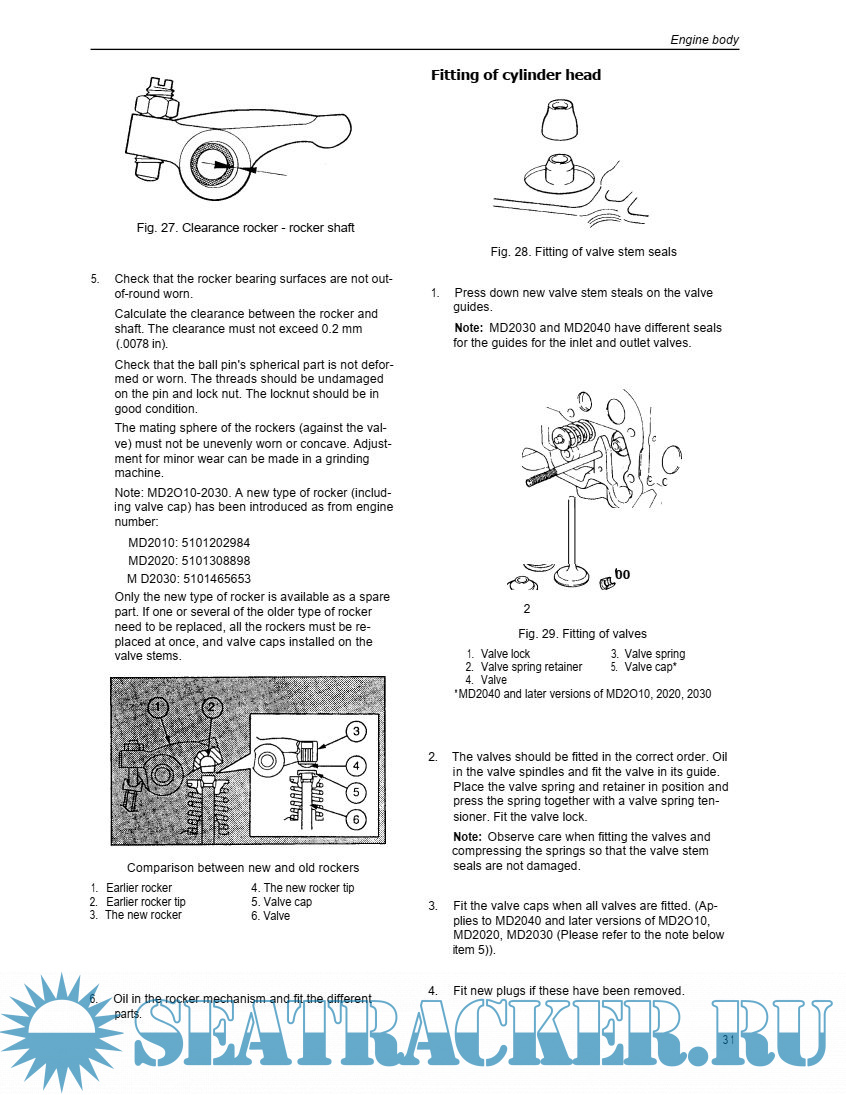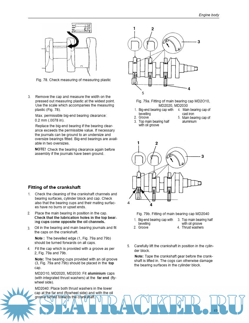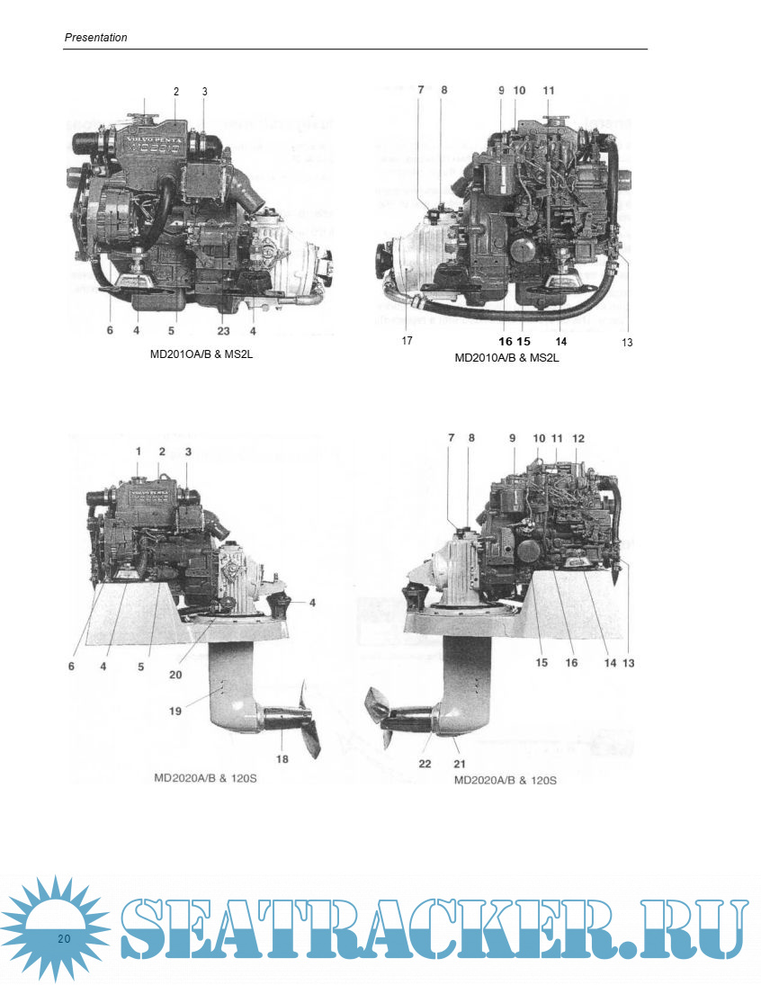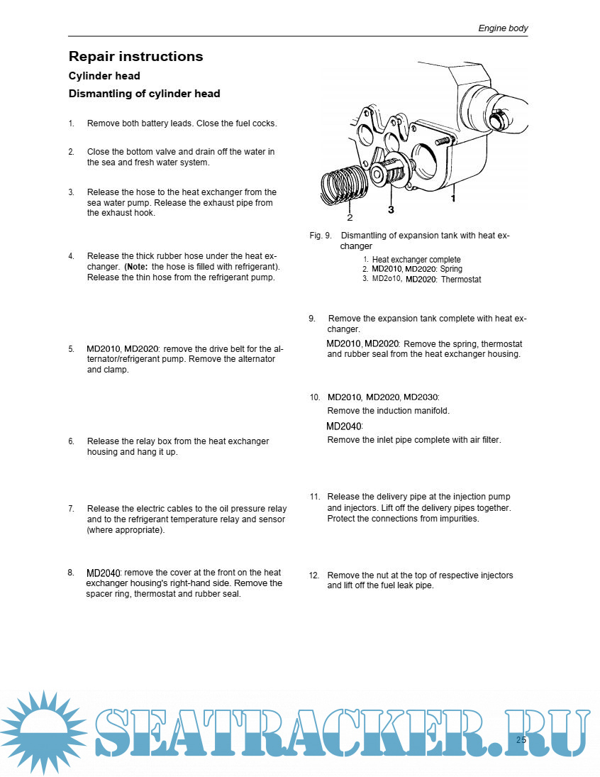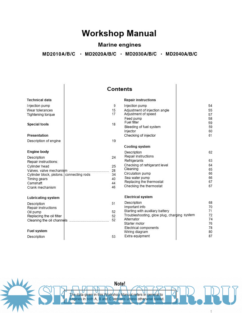 Description: Technical data, Special tools, Engine body, Lubricating system, Fuel system, Repair instructions, Cooling system and Electrical system description for marine engines D201OA/B/C • MD202OA/B/C • MD203OA/B/C • MD204OA/B/C.